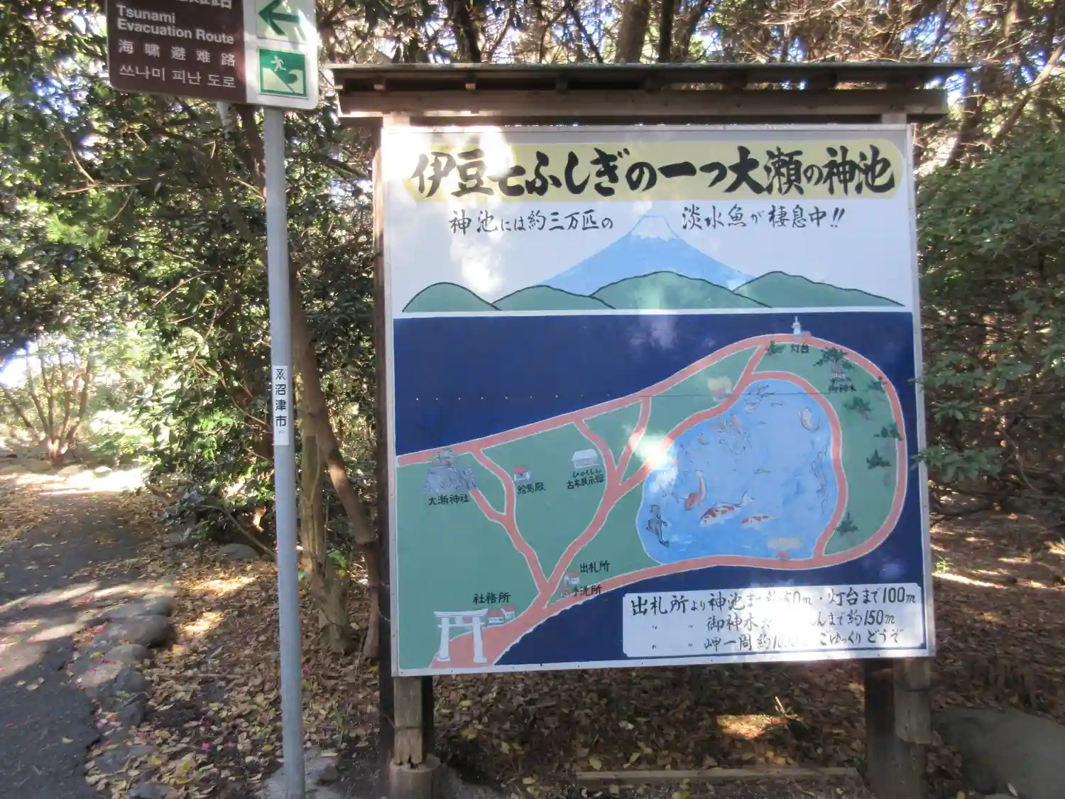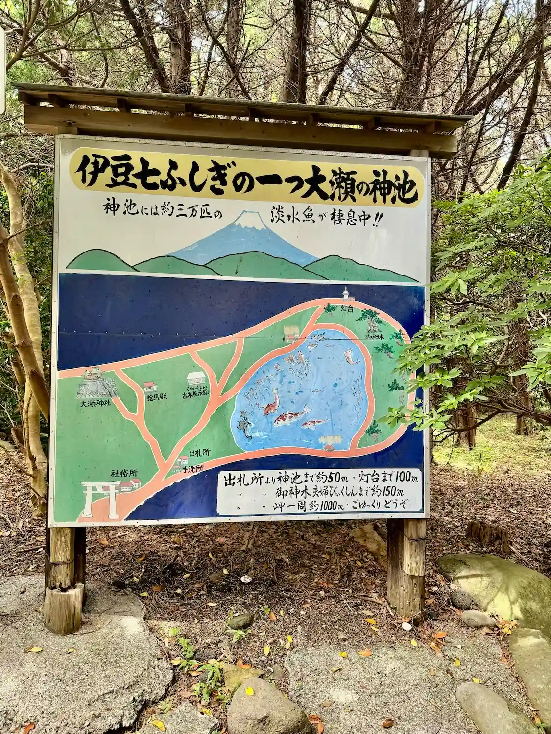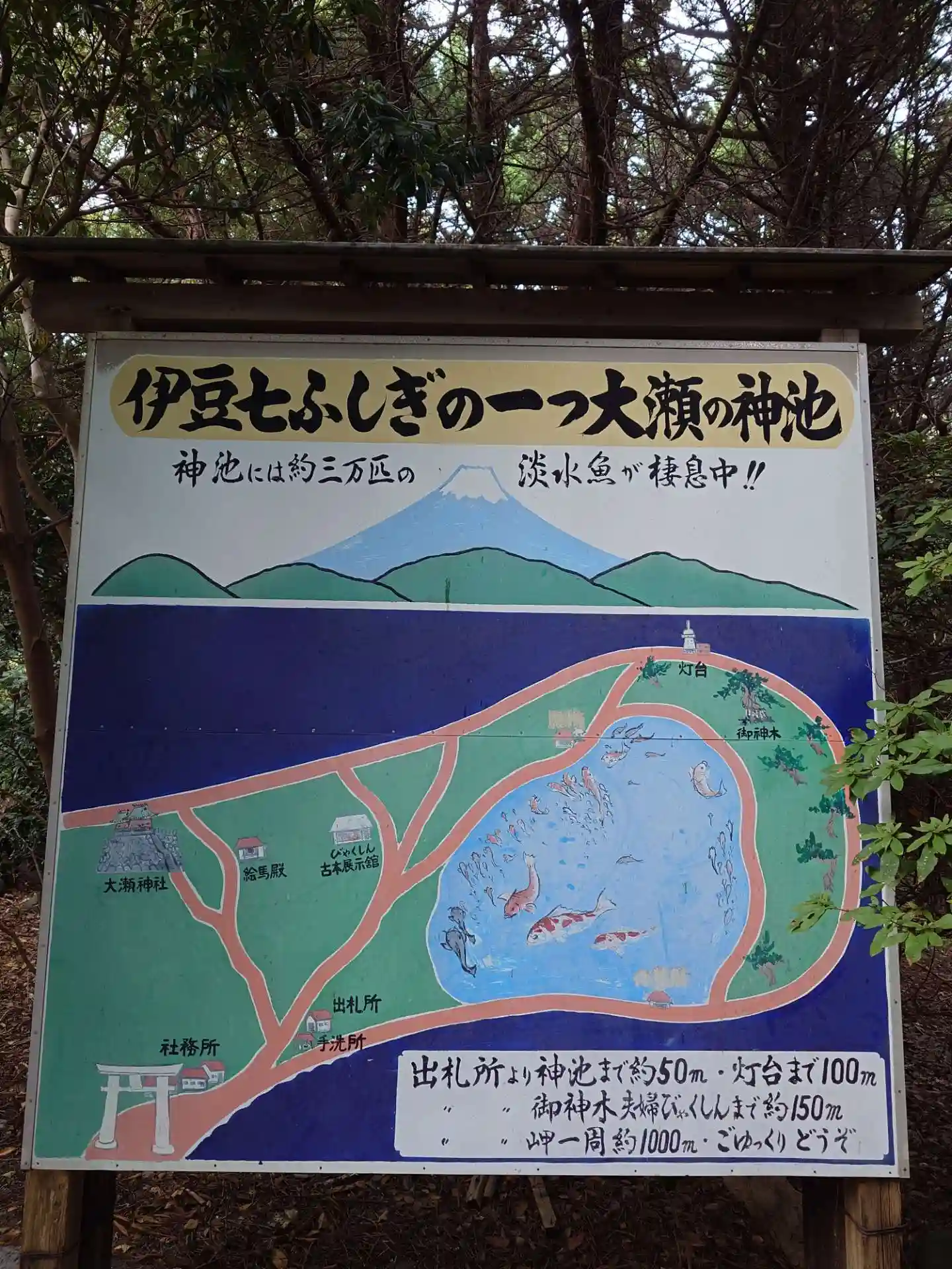 神池 周りを海に囲まれており、干満と関係する底なしの池とされながら、真水で鯉や鮒などの淡水魚が生息。伊豆の七不思議らしい。