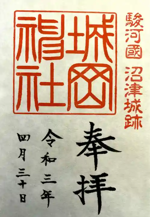 沼津城第二代の城主であり、江戸時代後期の老中・水野忠成公が文政7年(1824)に社殿を造営する際に、時の第11代将軍・徳川家斉公より京都「伏見稲荷大社」のご神体を拝受し、城の守護神としてこの地に奉斎し「稲荷神社」と称した。