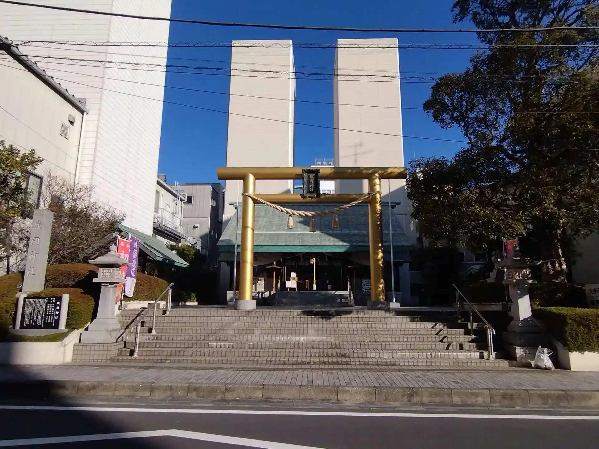 とにかく目立つ金色の鳥居があります。その奥には立派な本堂があります。
