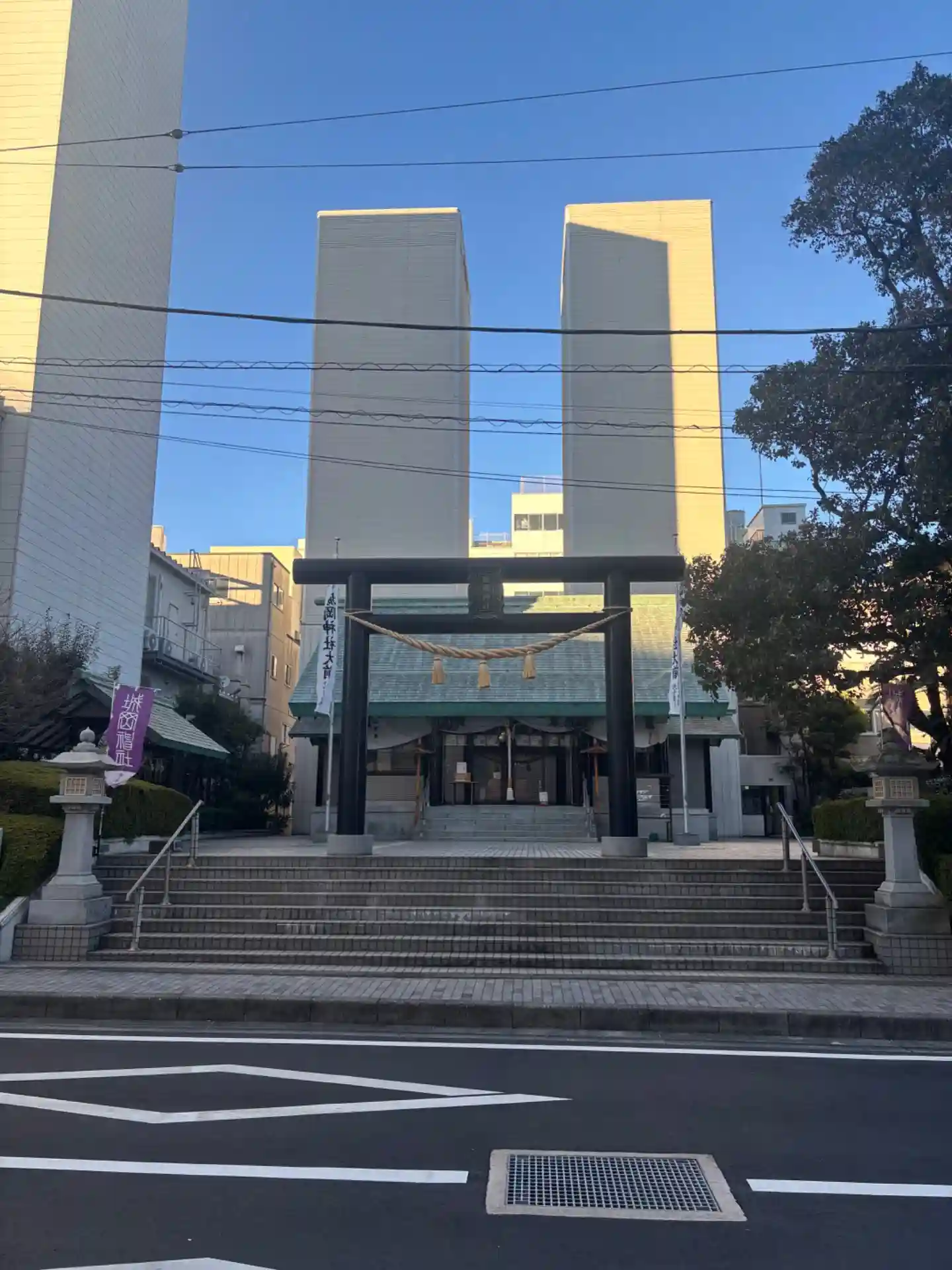 ビルに挟まれた神社、