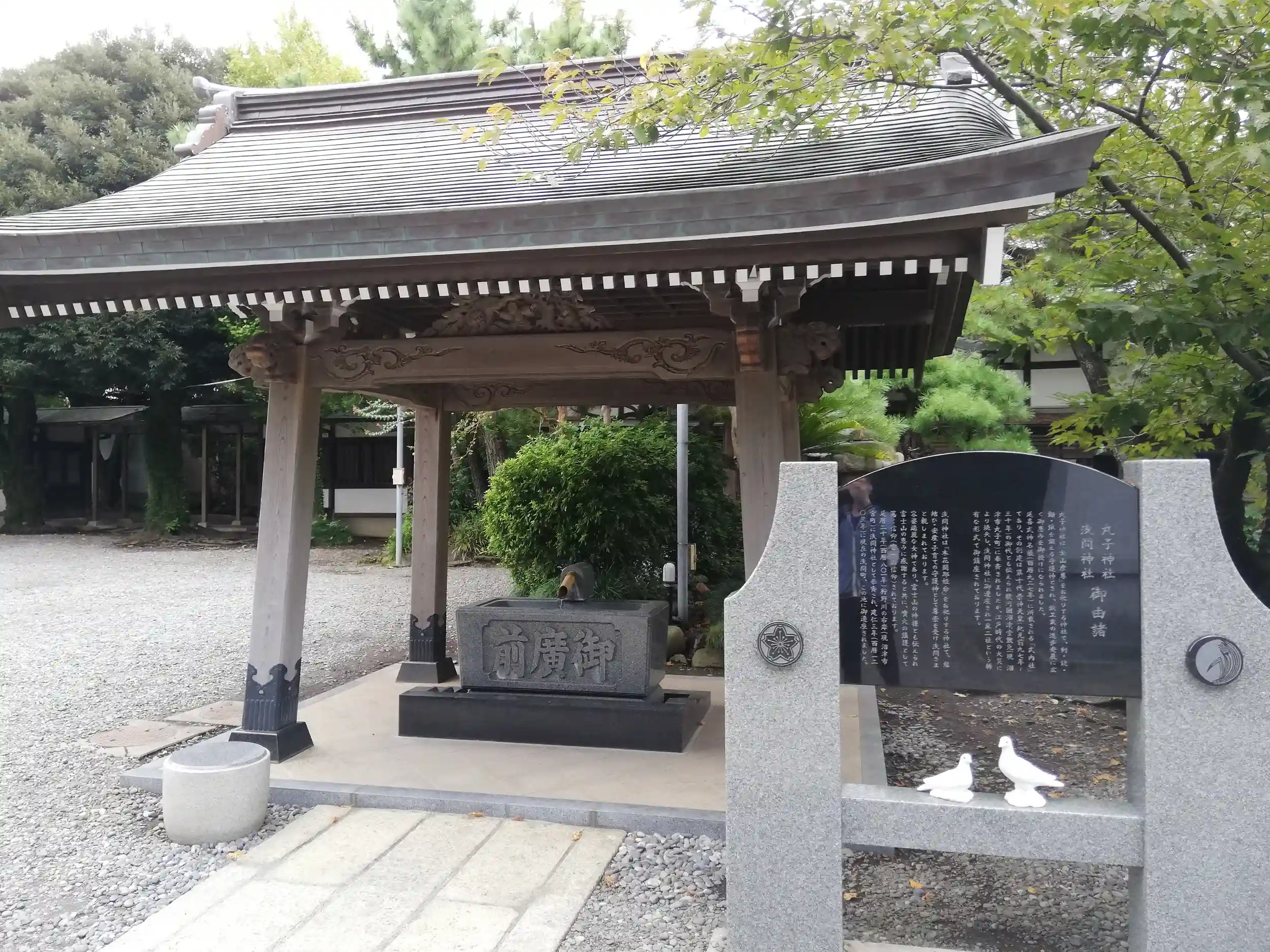 駿河国沼津堂敷免(現 沼津市丸子町)に、第10代崇神天皇の御代(紀元前97年~30年)に創建されたとも伝えられる「式内社」。江戸時代の火災により焼失してしまい、浅間神社に御遷座され稀有な形で鎮座されることになった。丸子町(丸子神社に由来して付けられた地名)の古社地には、小祠が再建され御旅所となっているそうです。
