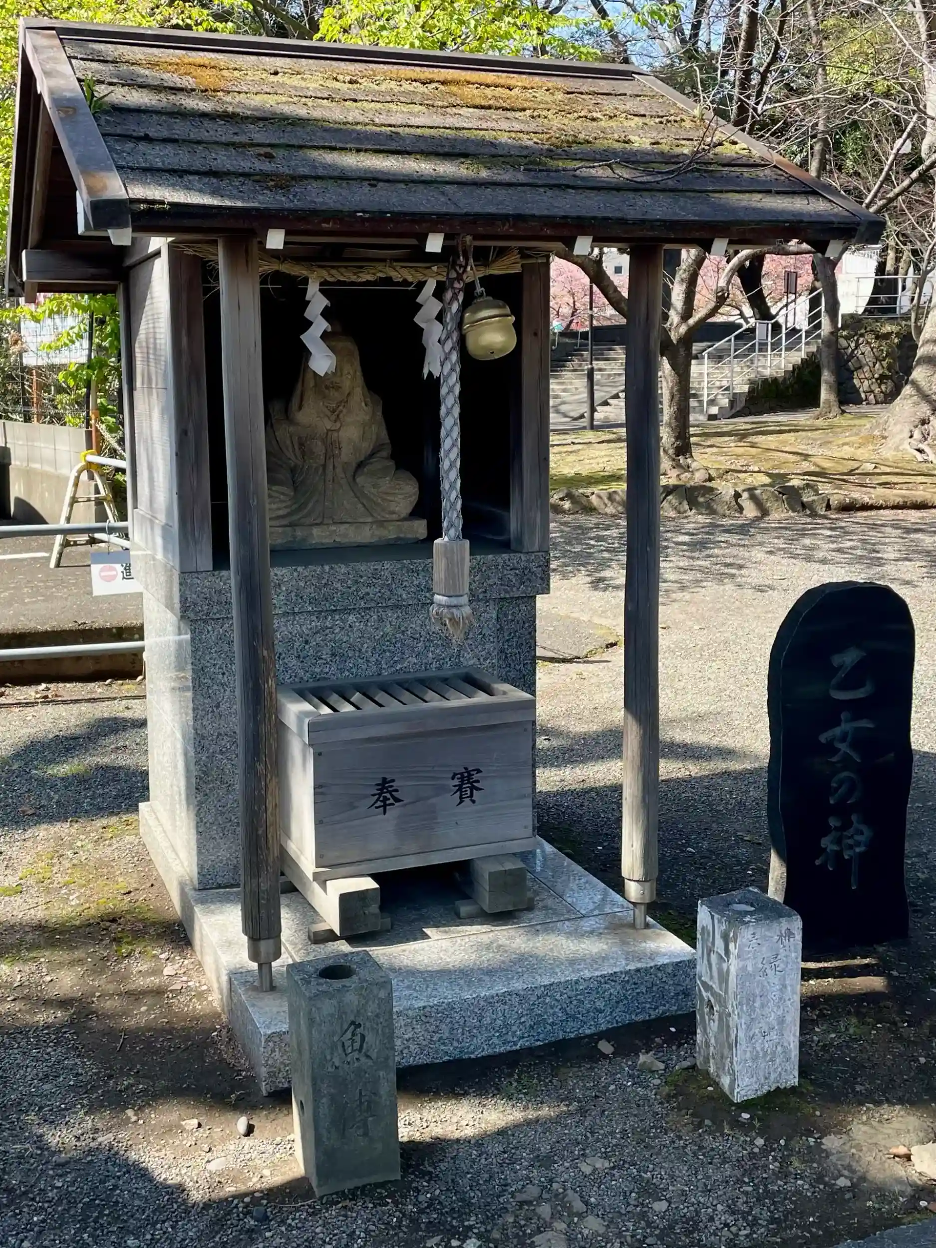 沼津市街地を流れる狩野川に架かる遊歩道「あゆみ橋」の先にある香貫公園の隣りに鎮座する。
