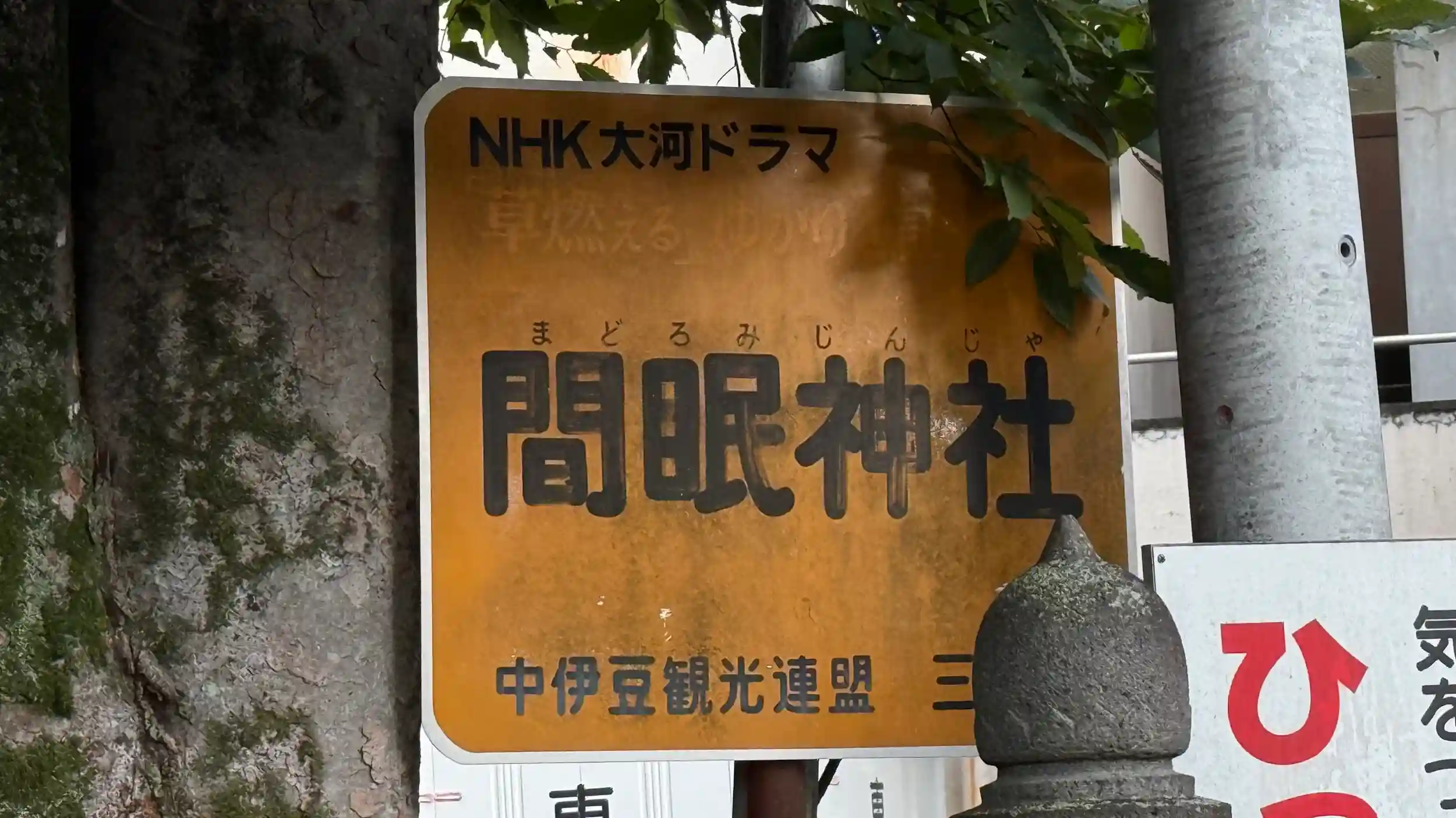 治承4年(1180年)、源頼朝が伊豆の蛭ケ小島に流されていた時、三嶋大社に源氏再興の願を立てる参詣の途中、この神社の境内の大きな松の木の根元で仮睡をしたことから、間眼(まどろみ)神社と呼ばれるようになったとされる。
