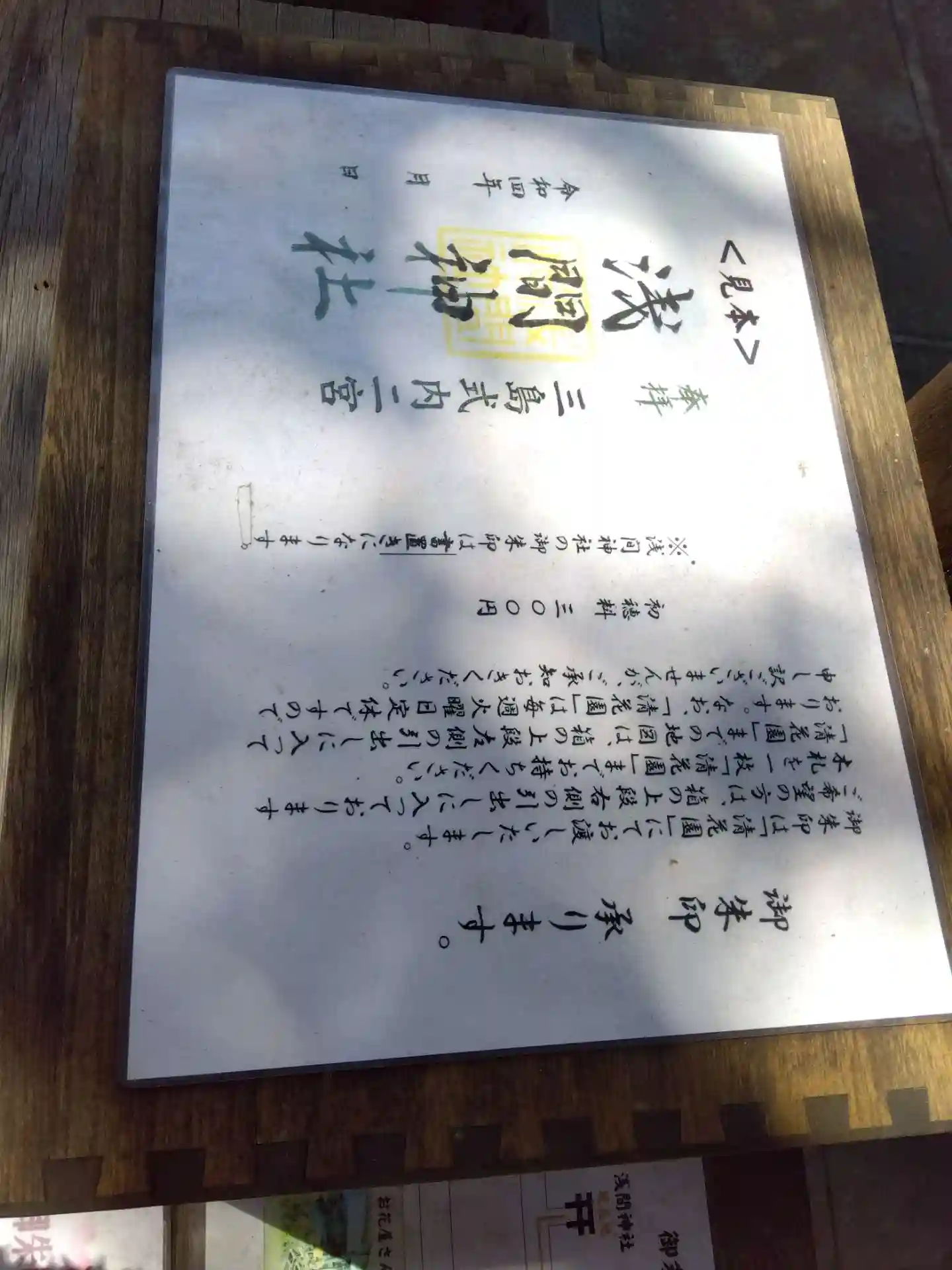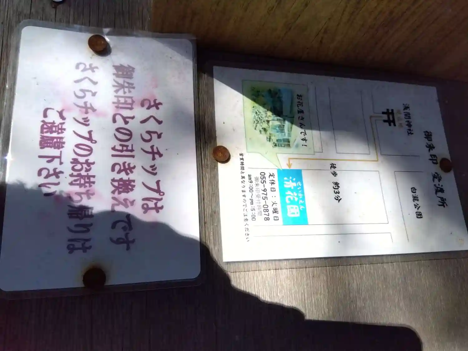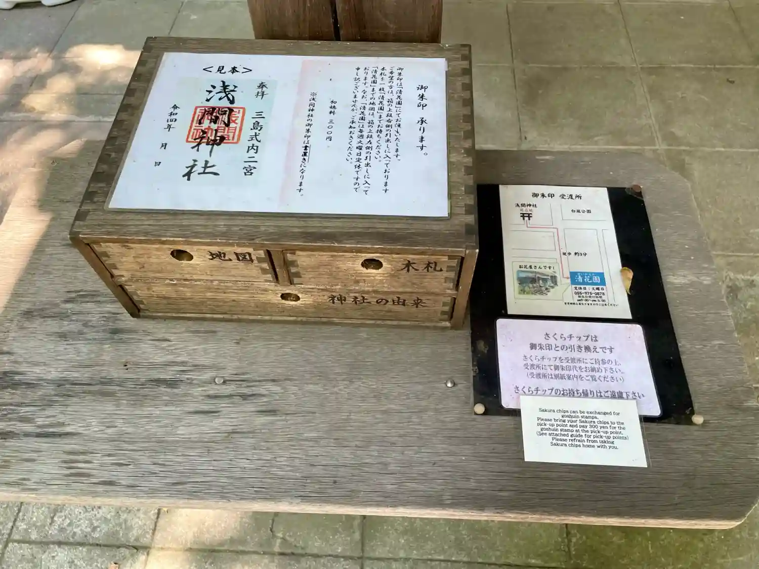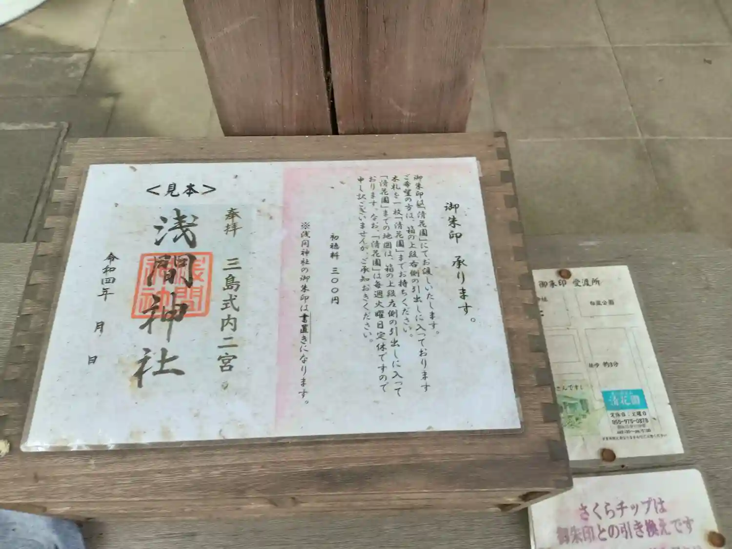 参拝すると木の入れ物に桜のチップがあり、近隣のお花屋さんで御朱印はいただきます。(お花屋さんが当日休店だったので日付は翌日)