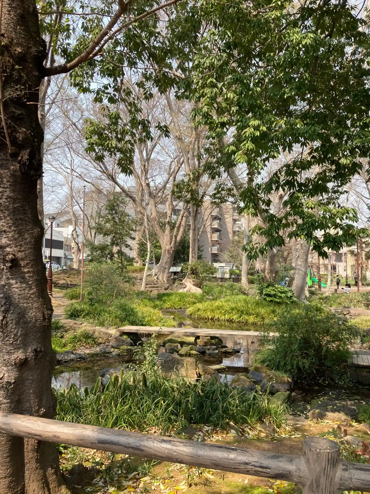 賑わう市街地に現れた緑地に立ちます。