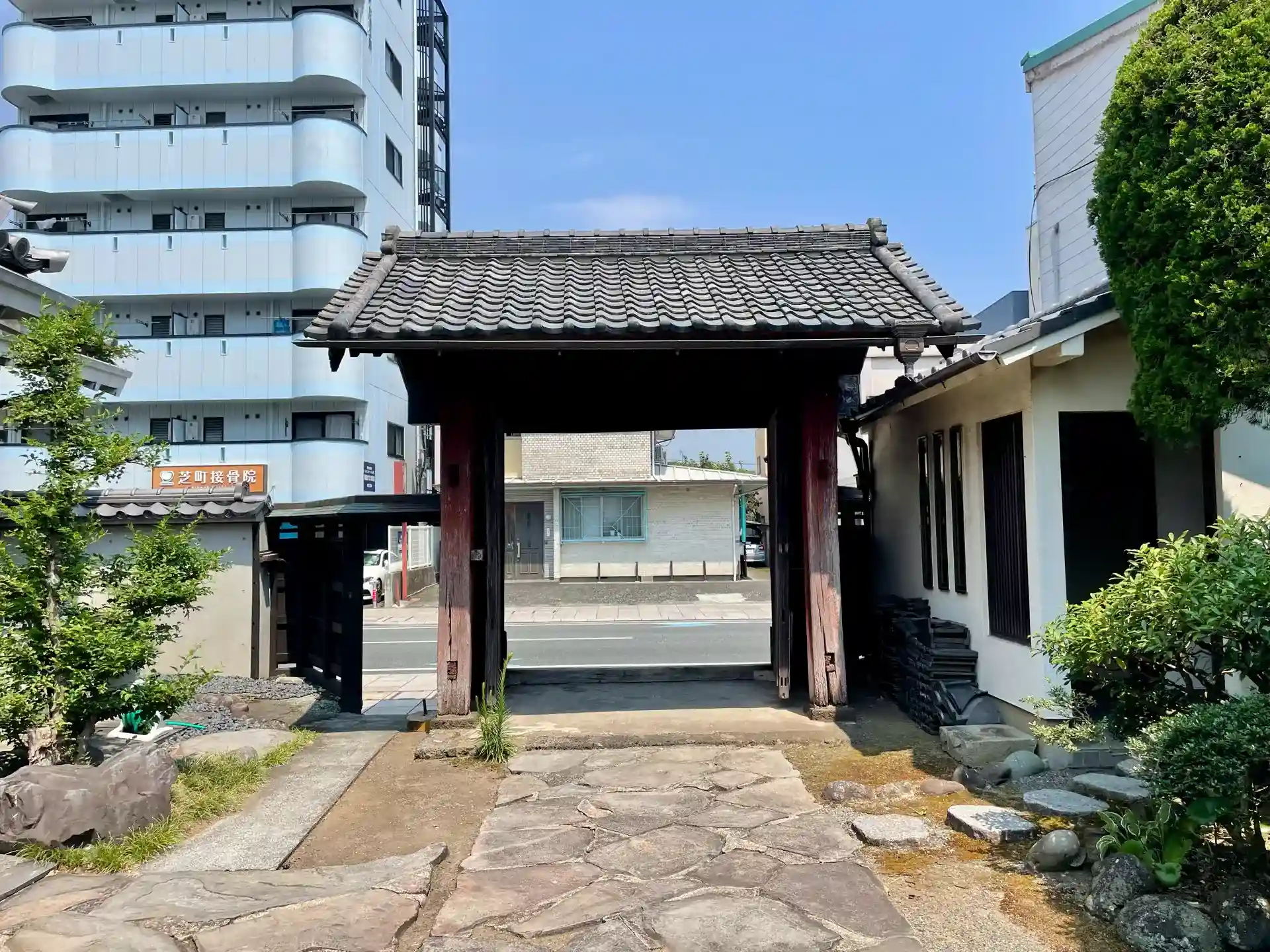 通り沿いに建つ山門は「赤門」と呼ばれ、東海道五十三次の11番目の宿場だった三島宿に2つあった本陣の一つである「世古本陣」の正門だったとされる。
