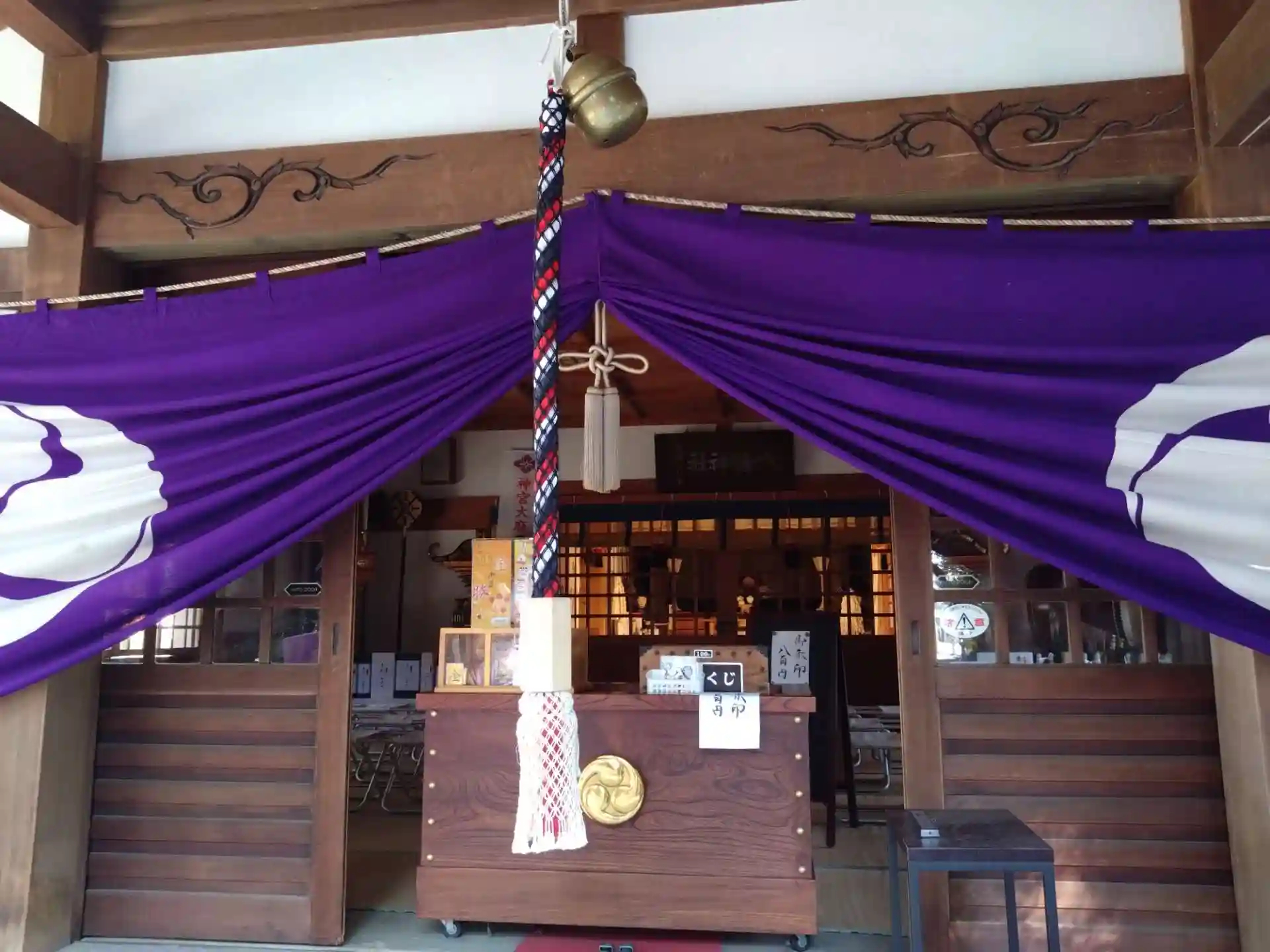 参道の正面に社殿がありますが、拝殿の前にあるボタンを押すと扉が開いて中を見ることができます。