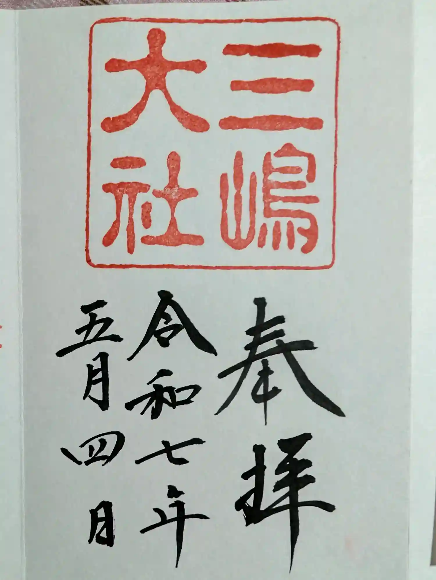 | 御朱印 | あり 上部に大きく三嶋大社の印が押され、右下に奉拝と書かれた御朱印です。