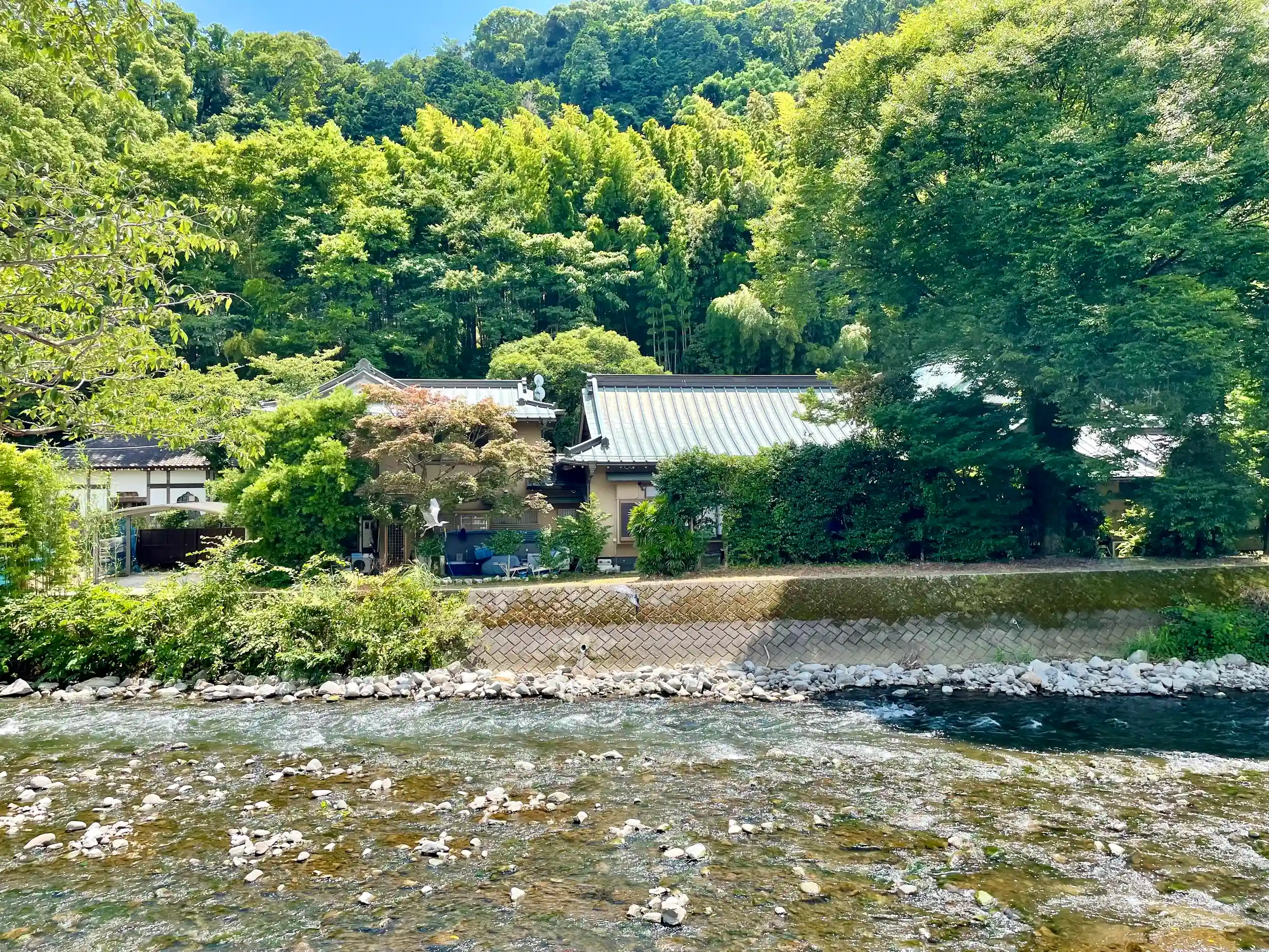 熱海と湯河原の境界線(静岡県と神奈川県の県境)となる千歳川沿いにある。