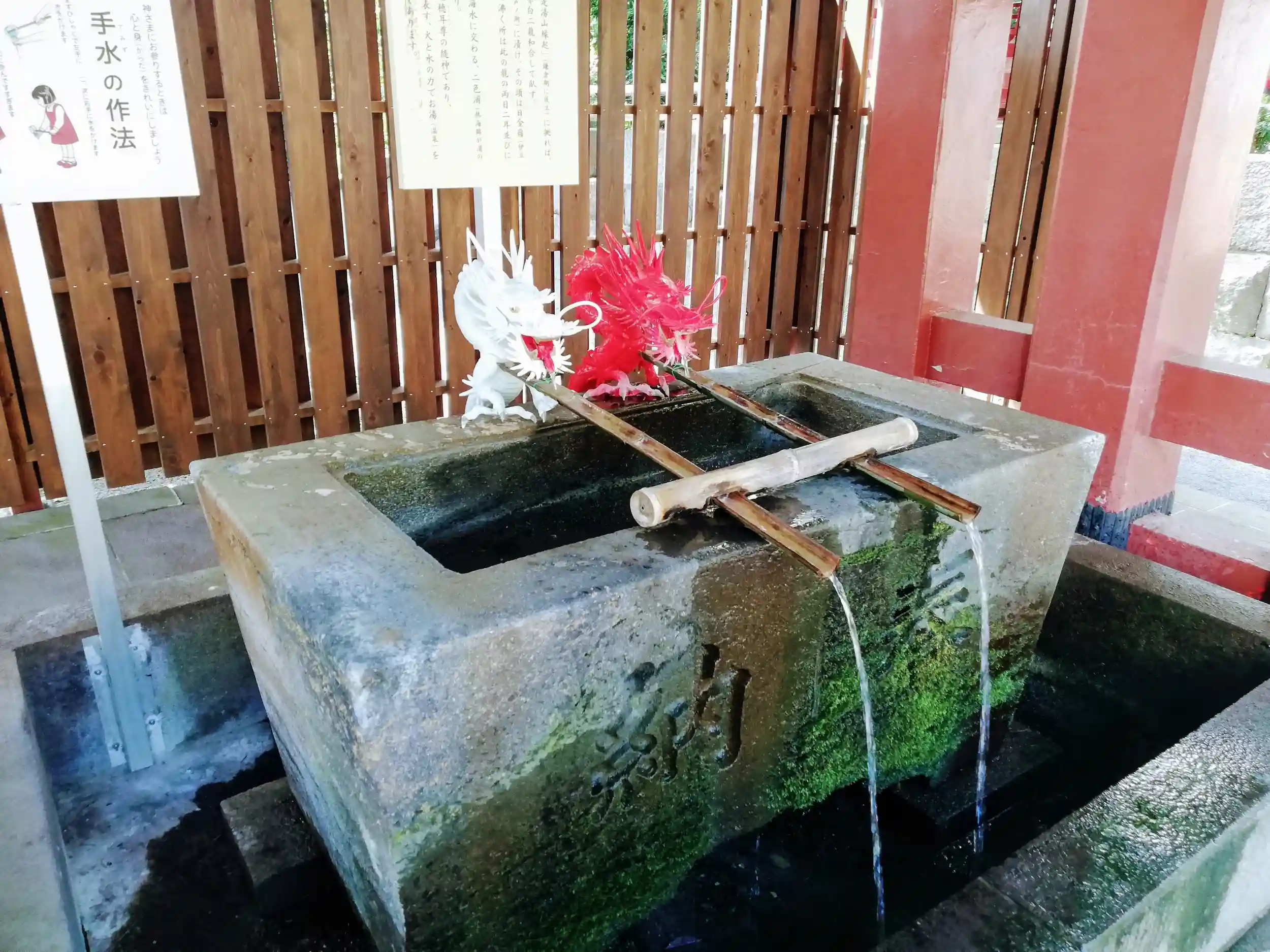 手水舎には赤色と白色の二匹の龍があります。この『赤白二龍』は伊豆山神社のシンボルになっているようです。