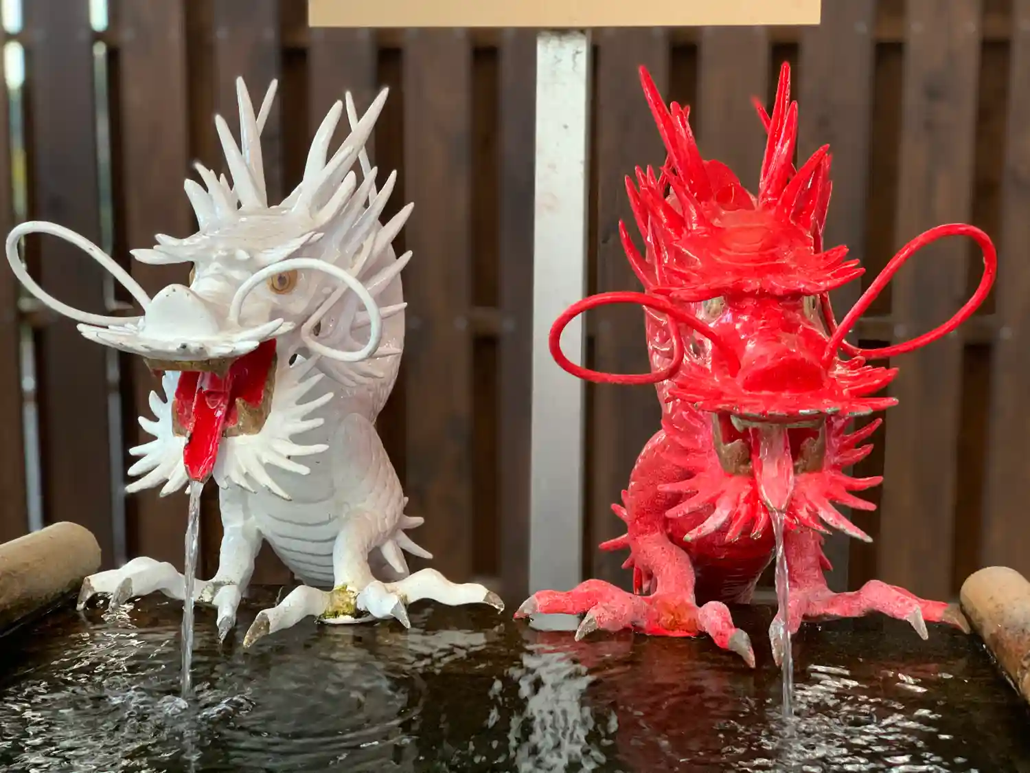 赤と白の龍が手水舎を守っています