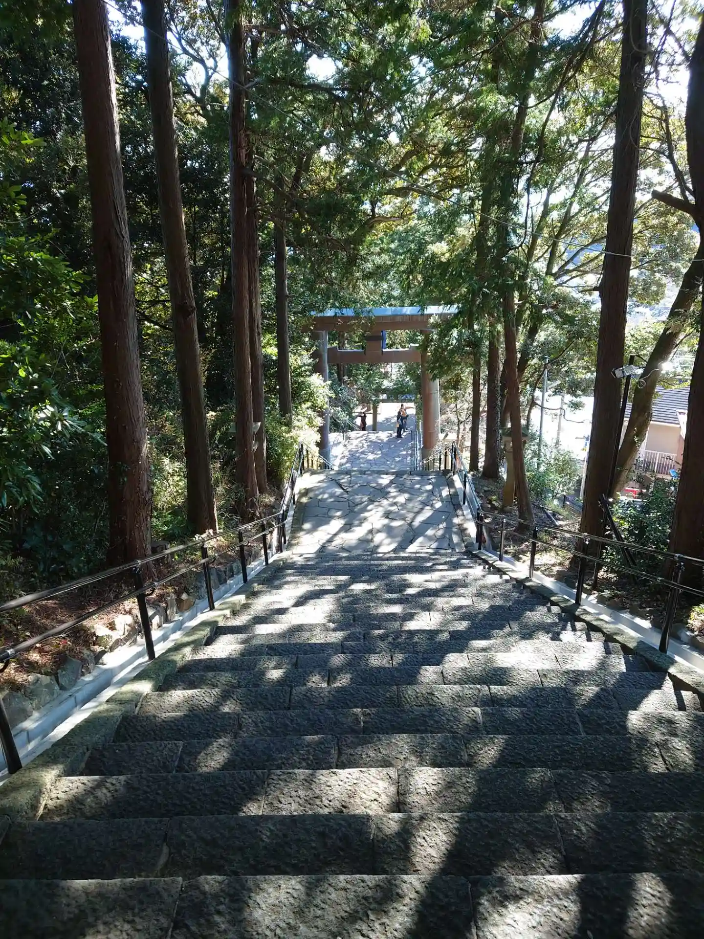 熱海駅からぐんぐんと勾配のある道路を走ること数分で到着。かなりの段数がある階段の上に広がる境内から…