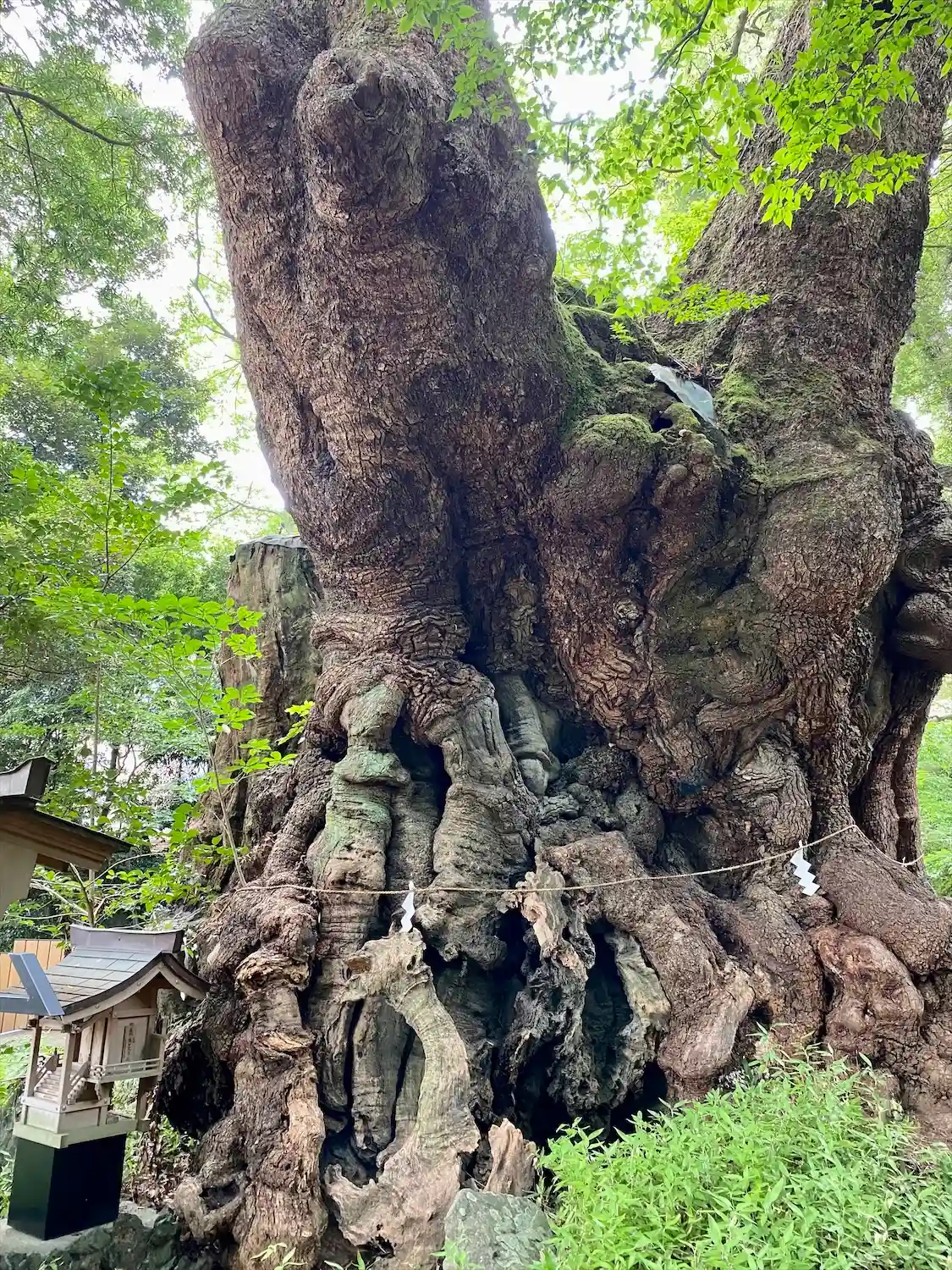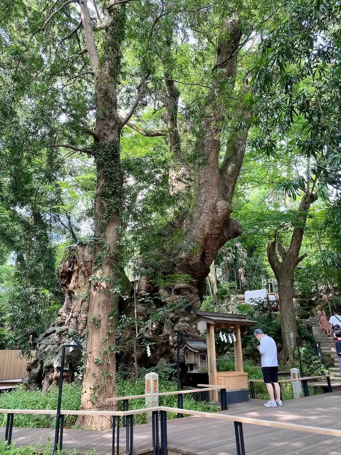 この神社の御神木である「大楠」は、樹齢約2000年、周囲24m(全国第2位)の太さを誇り、国の天然記念物に指定されていて、この周りを1周すると寿命が1年延びるといわれており、パワースポットとして多くの観光客で賑わっている。