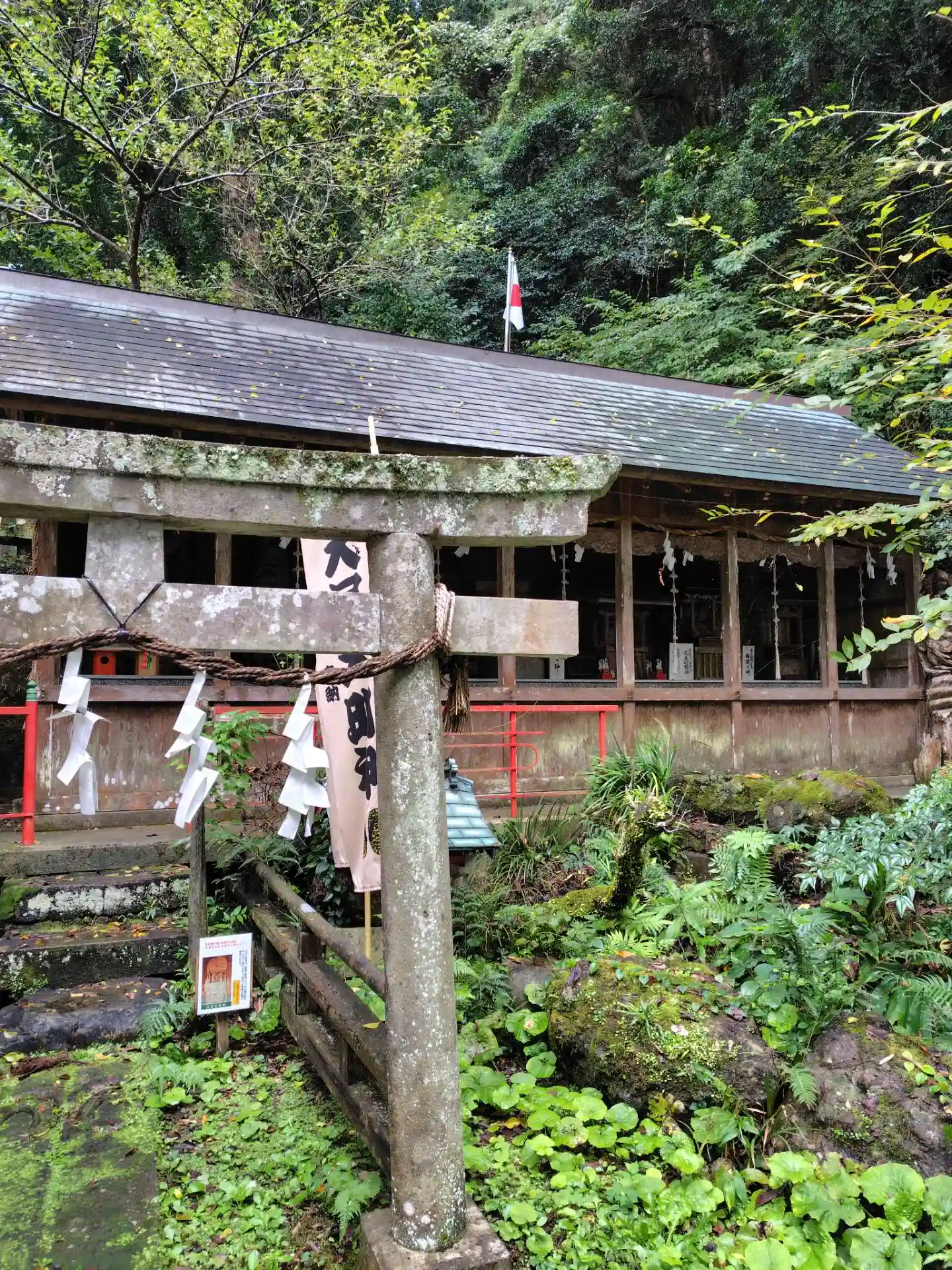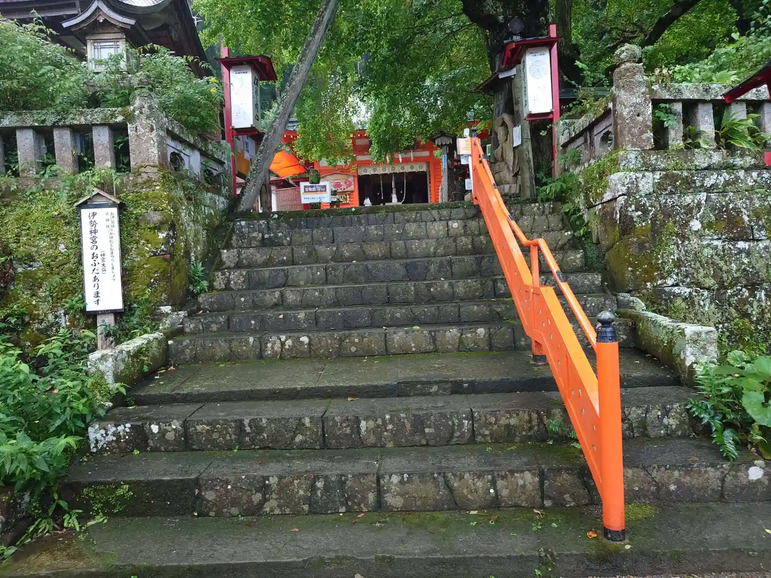 苔むした石段に手すりの赤がいい感じ。