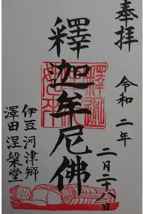 お釈迦様が生涯を閉じて涅槃に入る時の姿を現した涅槃像のある澤田涅槃堂。河津桜祭りに合わせて開帳していて御朱印も頂けました。
