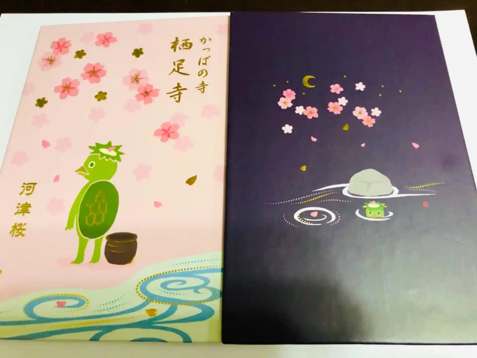 桜の中にたたずむカッパさんの御朱印帳に3面見開きの満開の河津桜の御朱印です。とても素敵で気持ちがぱっと華やぎます(✿◠‿◠)