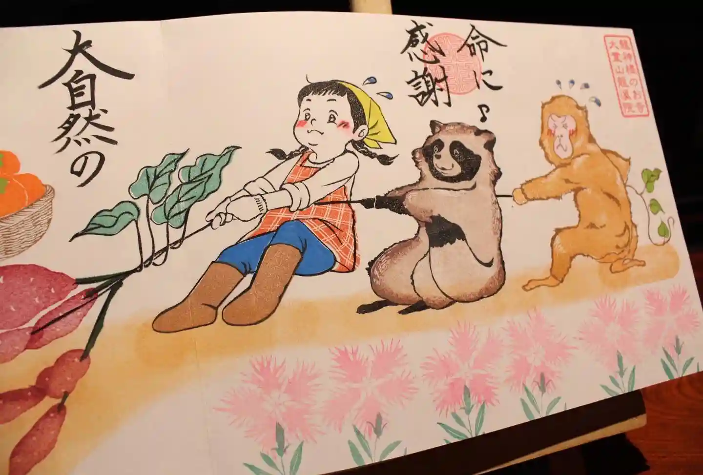 動物たちも女の子に手伝って芋掘りをしているところ😌大きなお芋ですね🍠柿にキノコも収穫😄あれれ?!皆頑張って蔓を引っ張っているのにたぬき君だけ手を抜いてる!ちゃんと引っ張って〜笑😆