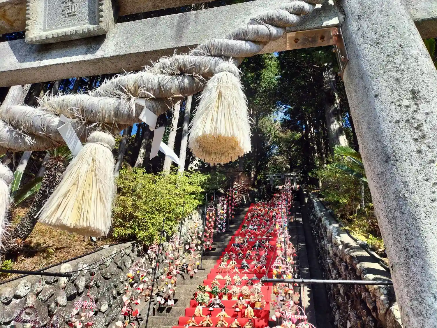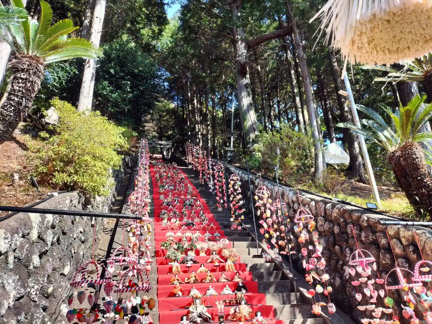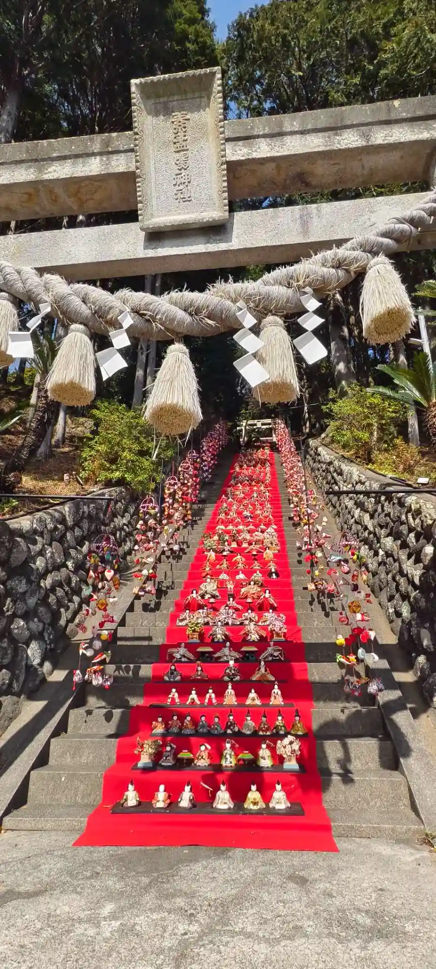 伊豆稲取のつるし雛祭りに合わせて開催されている雛壇飾りが圧巻の素盞鳴神社。段数日本一の118段の石…