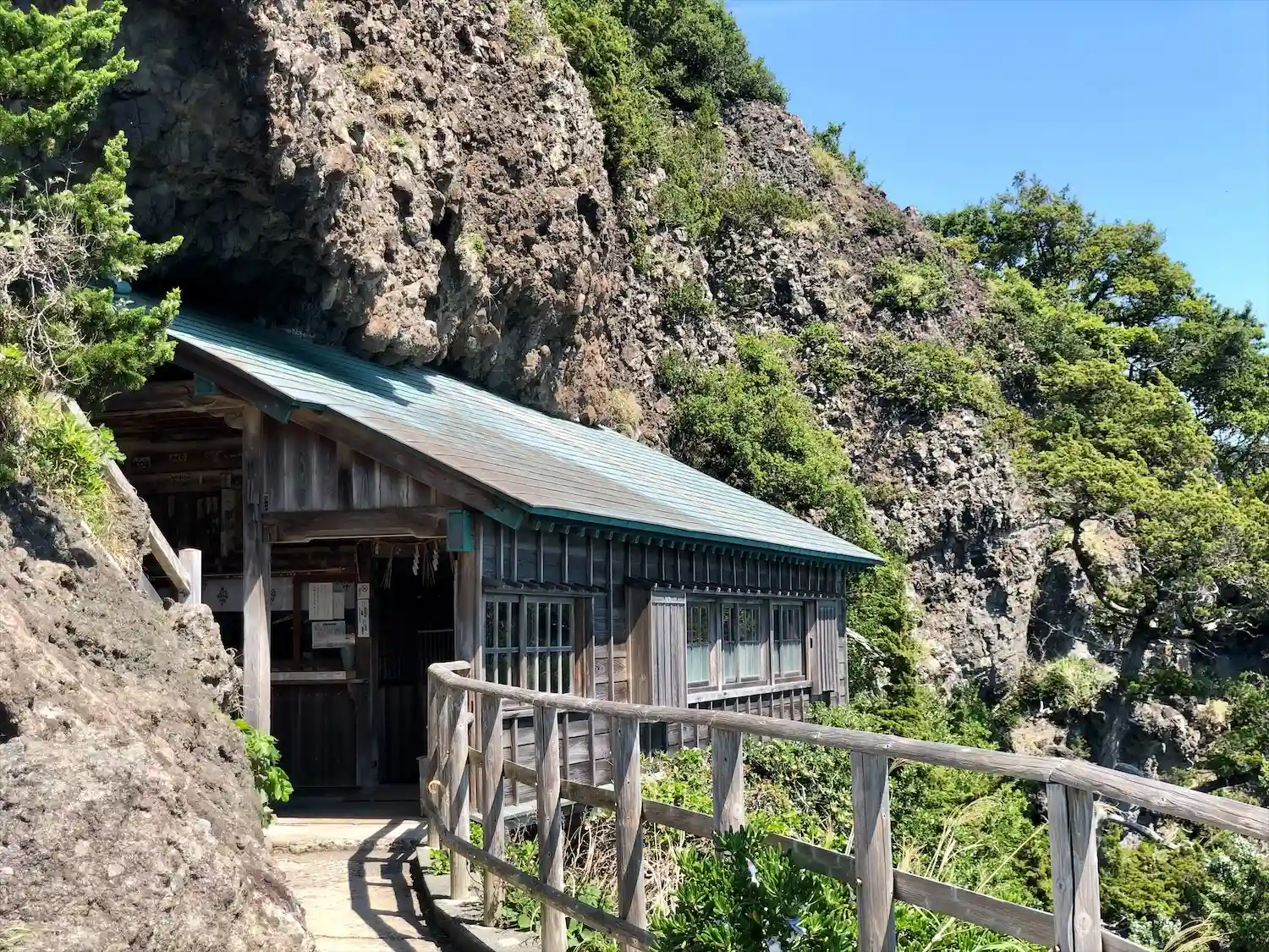 社殿が岩にめり込んでいるように見えます。