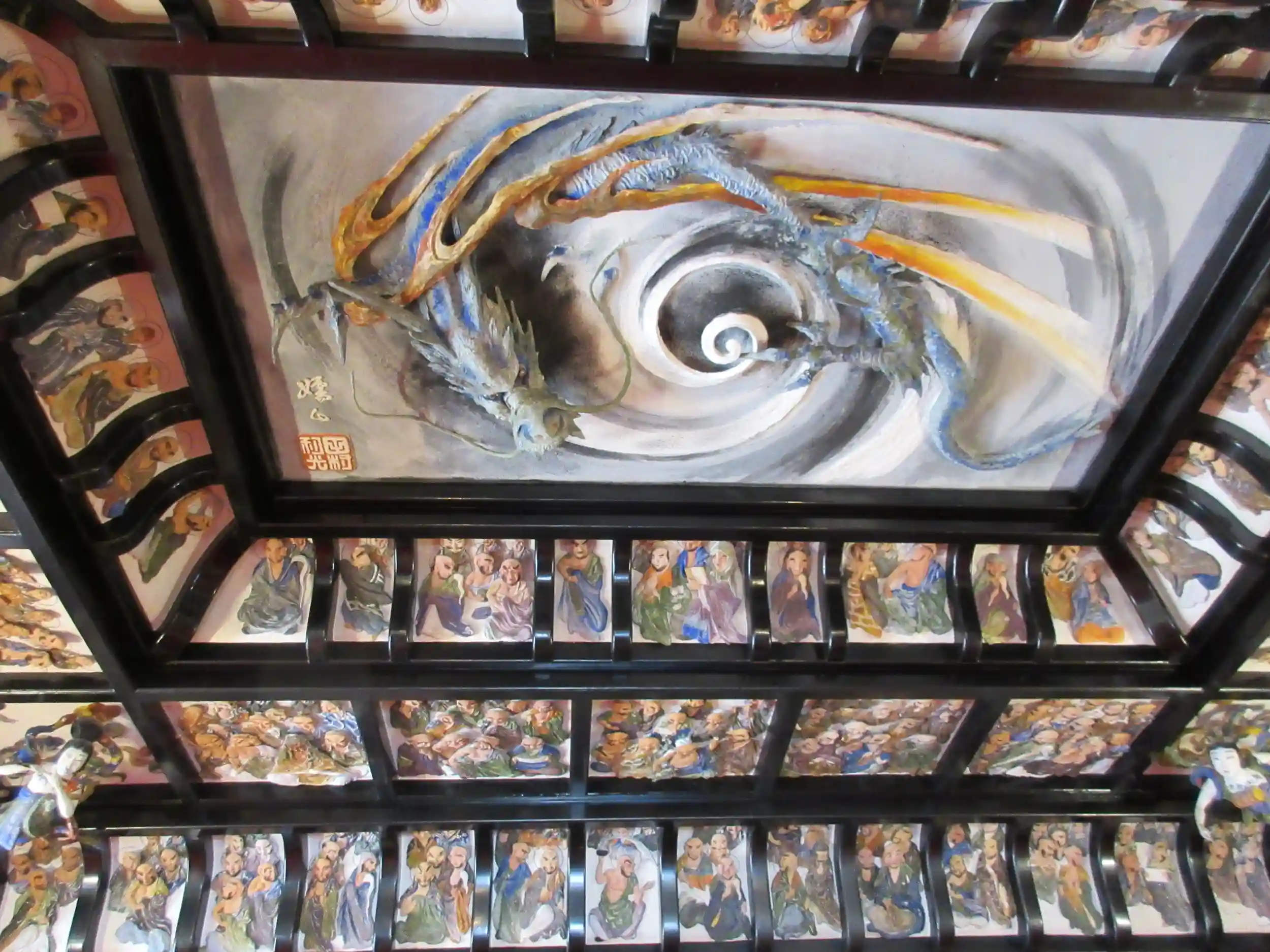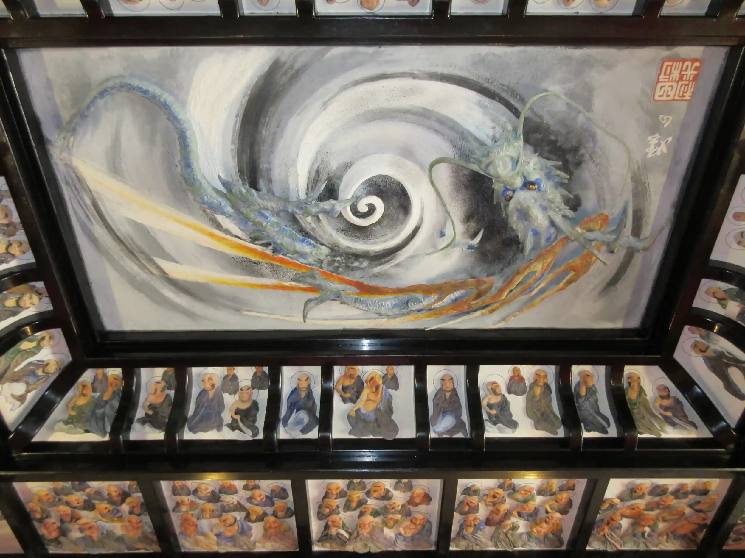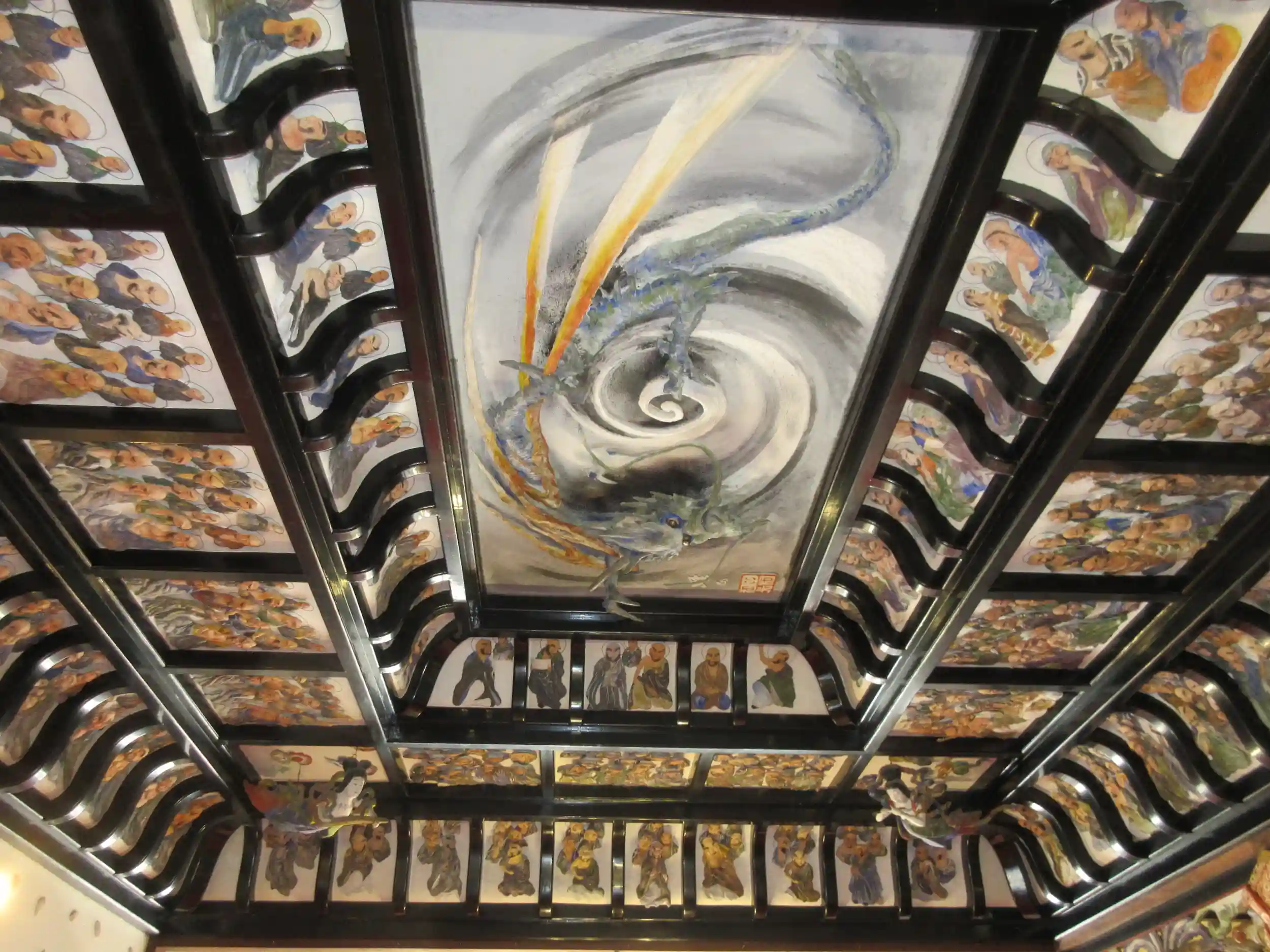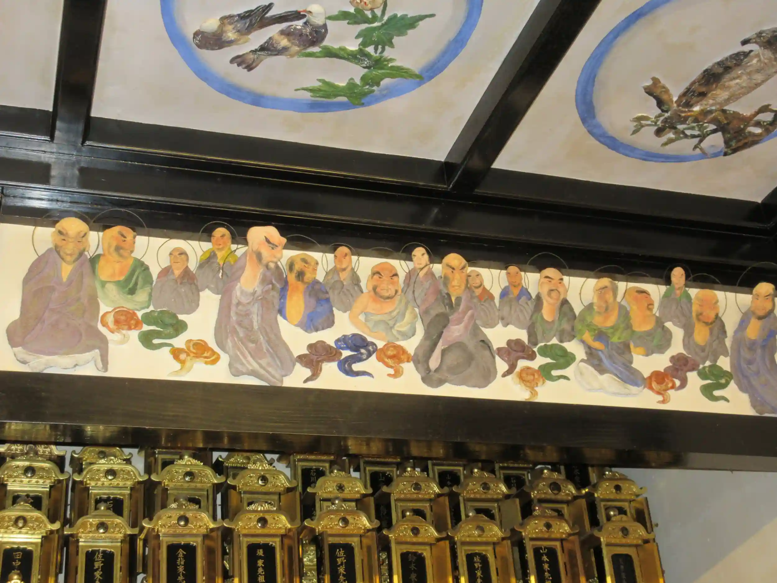 伍番目に訪れたのは、漆喰で描かれた五百羅漢の天井画がとても素晴らしい「東福寺」😌このお寺は、土肥達磨寺の方に情報を頂き(ありがとうございます🙏)急遽参拝させていただきました😊通常日曜日などは法事等で拝観はさせてもらえないそうですが、たまたま住職の手が空いたらしく快く拝観させてもらえました😊本堂に入って「超ビックリ」天井に漆喰で描かれた五百羅漢があり、四隅には天女、その中心には今にも動きそうな龍が描かれていました😊住職の説明によると100年は経過しているそうです😊ほんとにすごい・・・🥰ちょっと調べてみたら、松崎町出身の左官職人の名工・入江長八(美術館もあるような名工です)のお弟子さんで群馬県出身の左官職人田村利光の作品で、大正末期に東福寺本堂に檀家さんの一人から両親を供養するため、五百羅漢の鏝絵を寄付する依頼を受け西伊豆に入って4年と8カ月の歳月をかけて五百羅漢の鏝絵を仕上げたそうです。本堂の正面の御本尊に向かい並んでいる老夫婦がそのご両親と言われています😊ちなみに長八の作品は「浄感寺」で見れるそうです😊当日は時間がなく見れませんでした😓