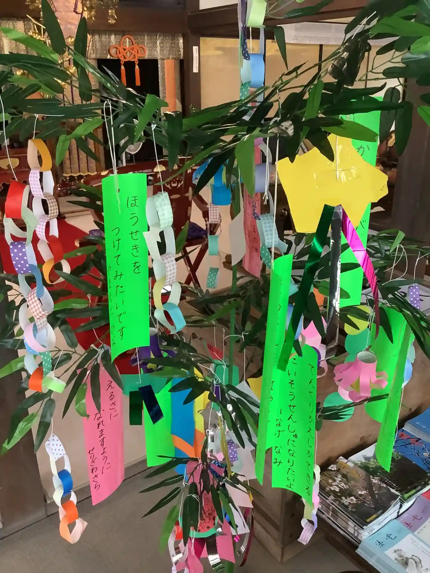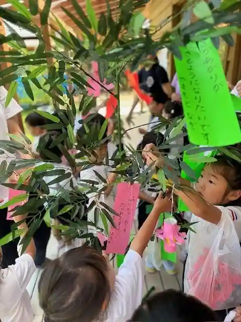 自分で作った七夕飾りを一所懸命取り付けています