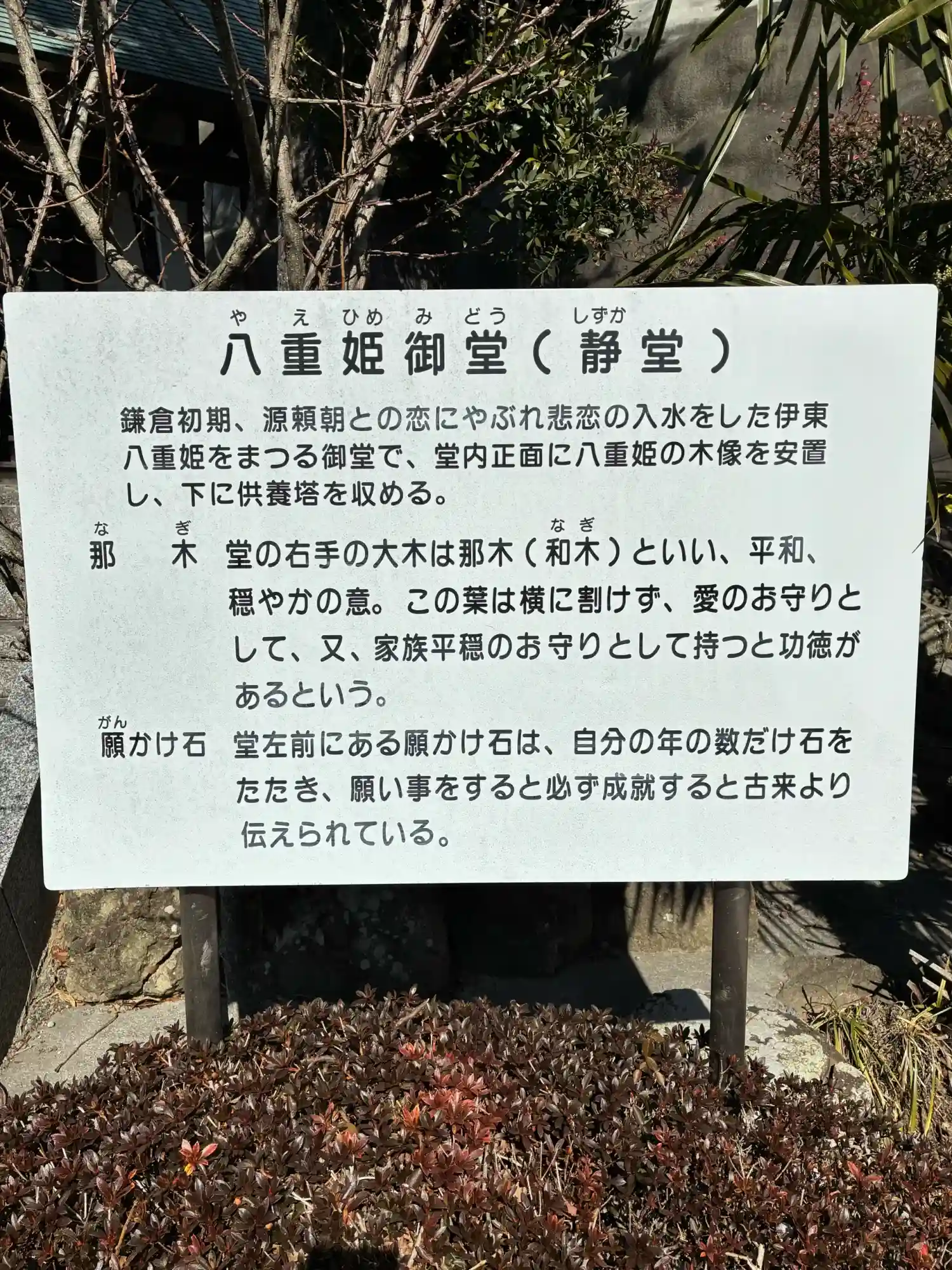 境内には、源頼朝との悲恋に死んだ伊東祐親の娘八重姫の供養塔がある。