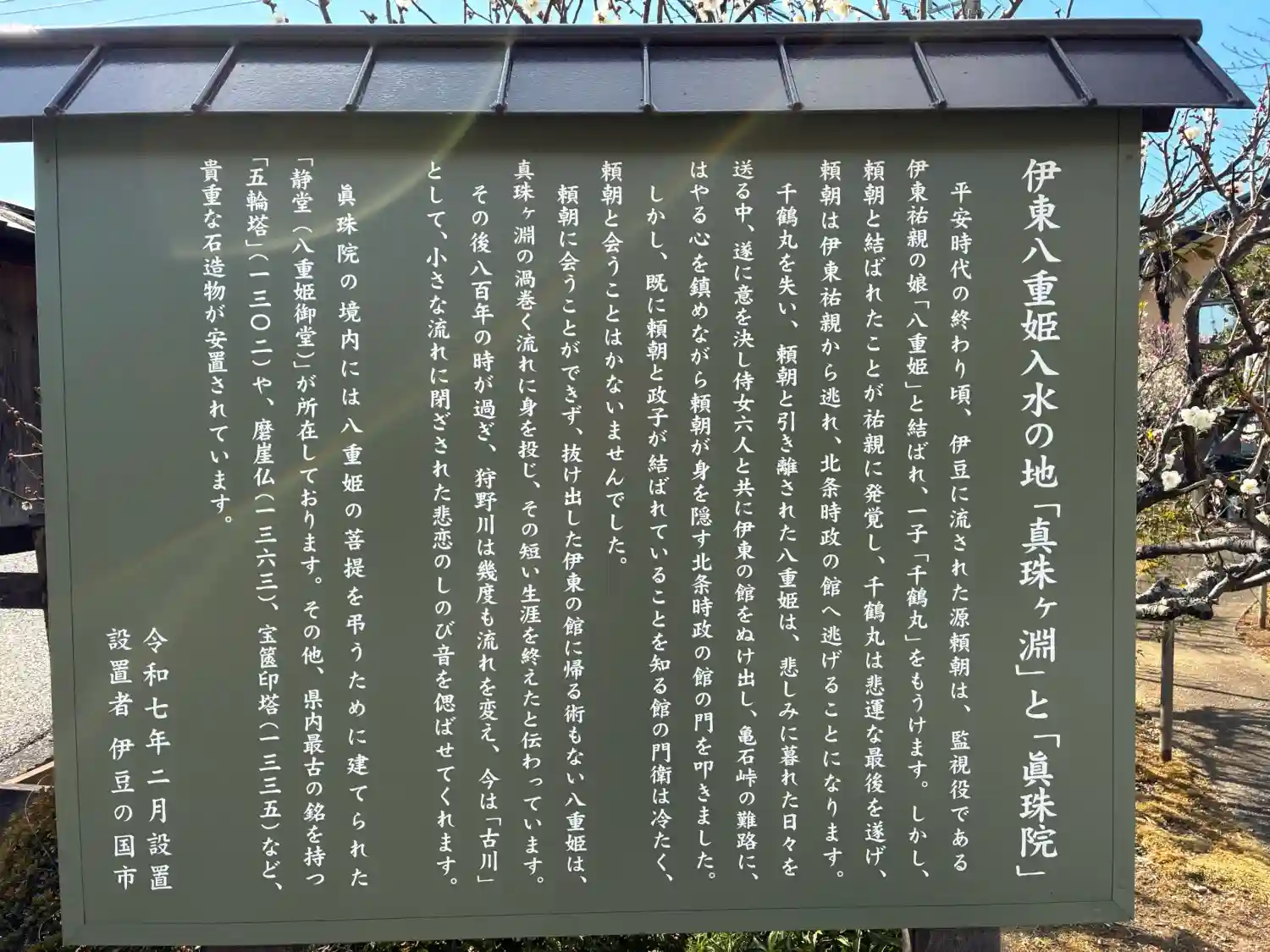 伊東館に帰ることもできない八重姫は、寺の南にあったという真珠ヶ淵の渦巻く流れの中に身を投げたのだと伝えられている。