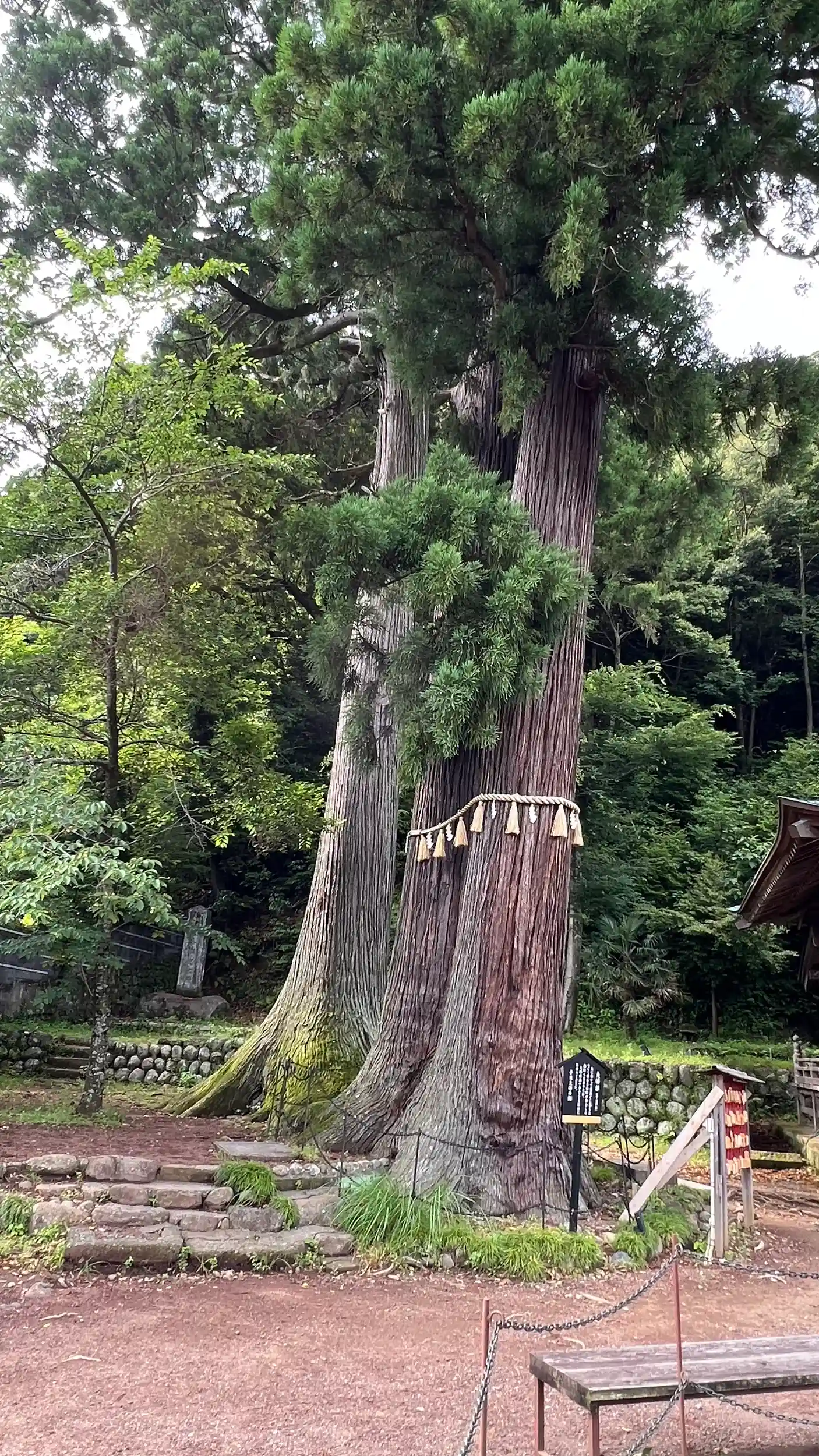 参道を進んだり左側に大きな御神木、正面拝殿、右奥に社務所。