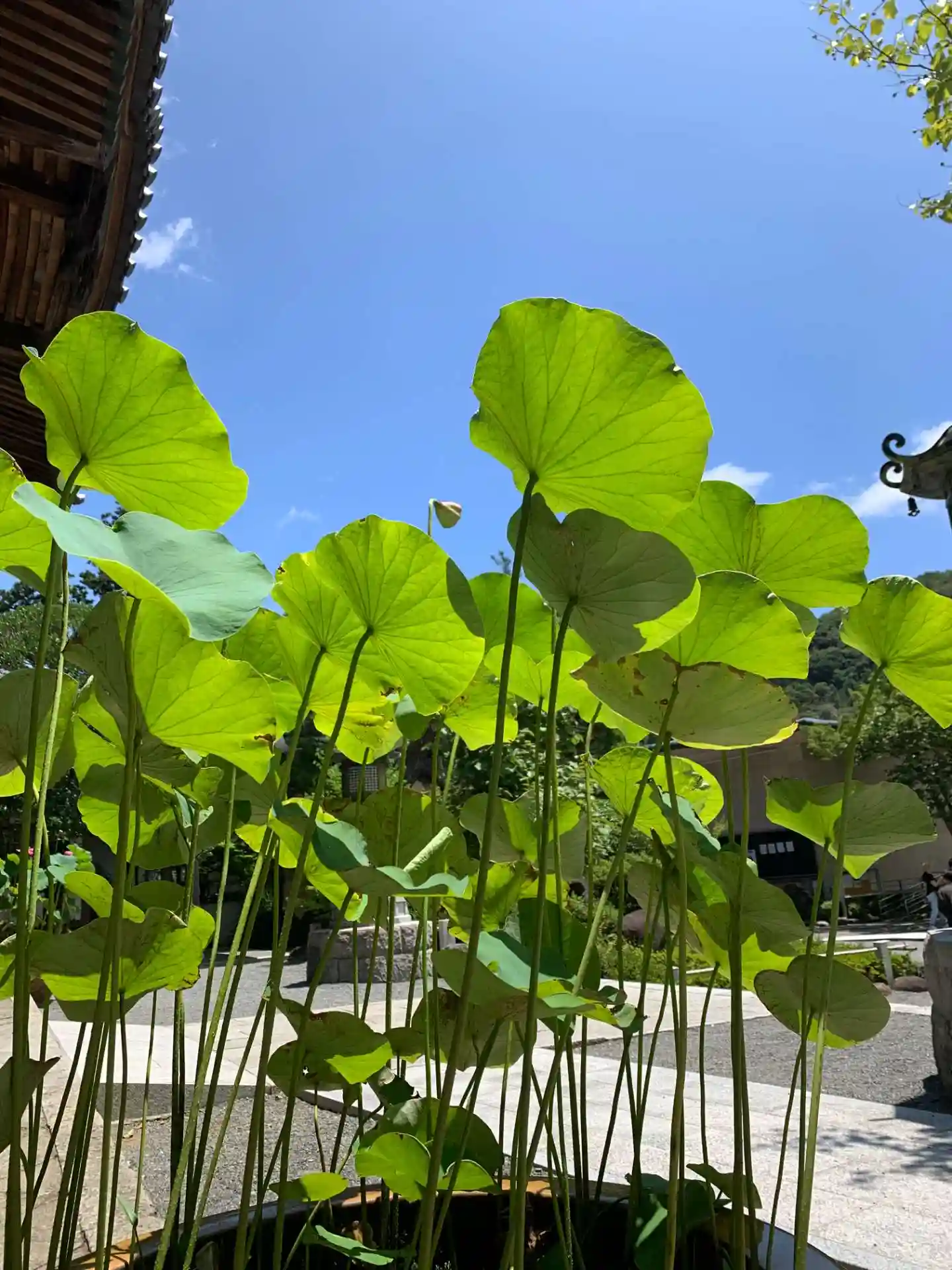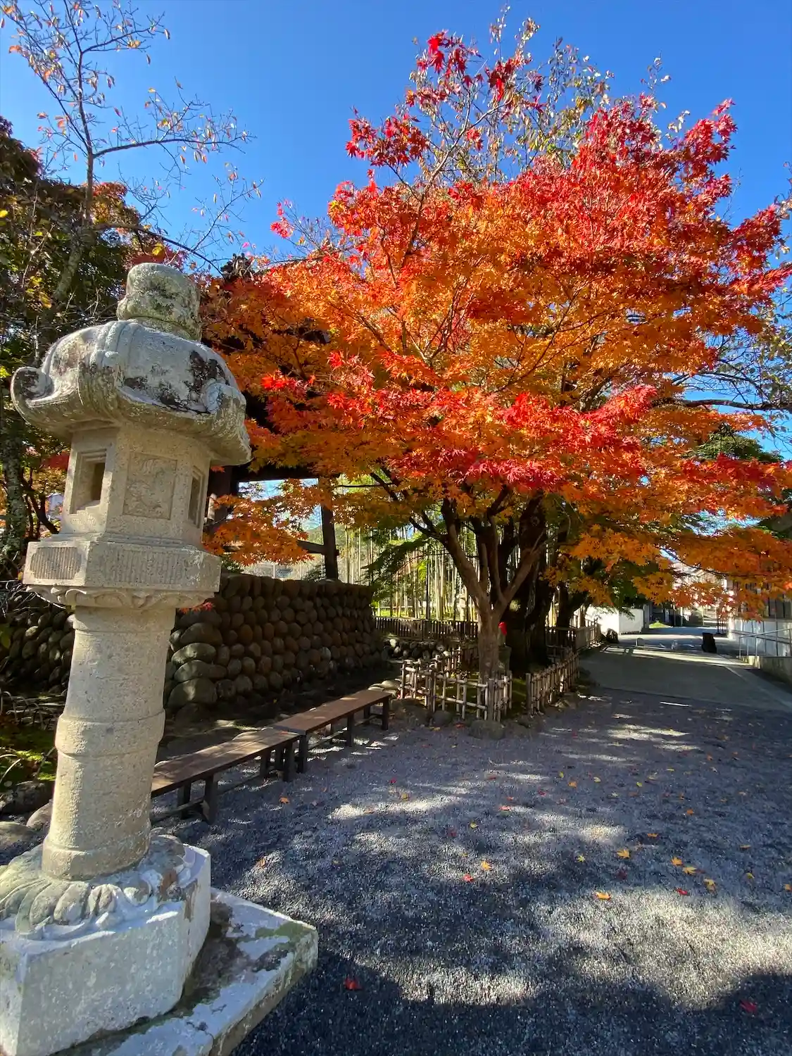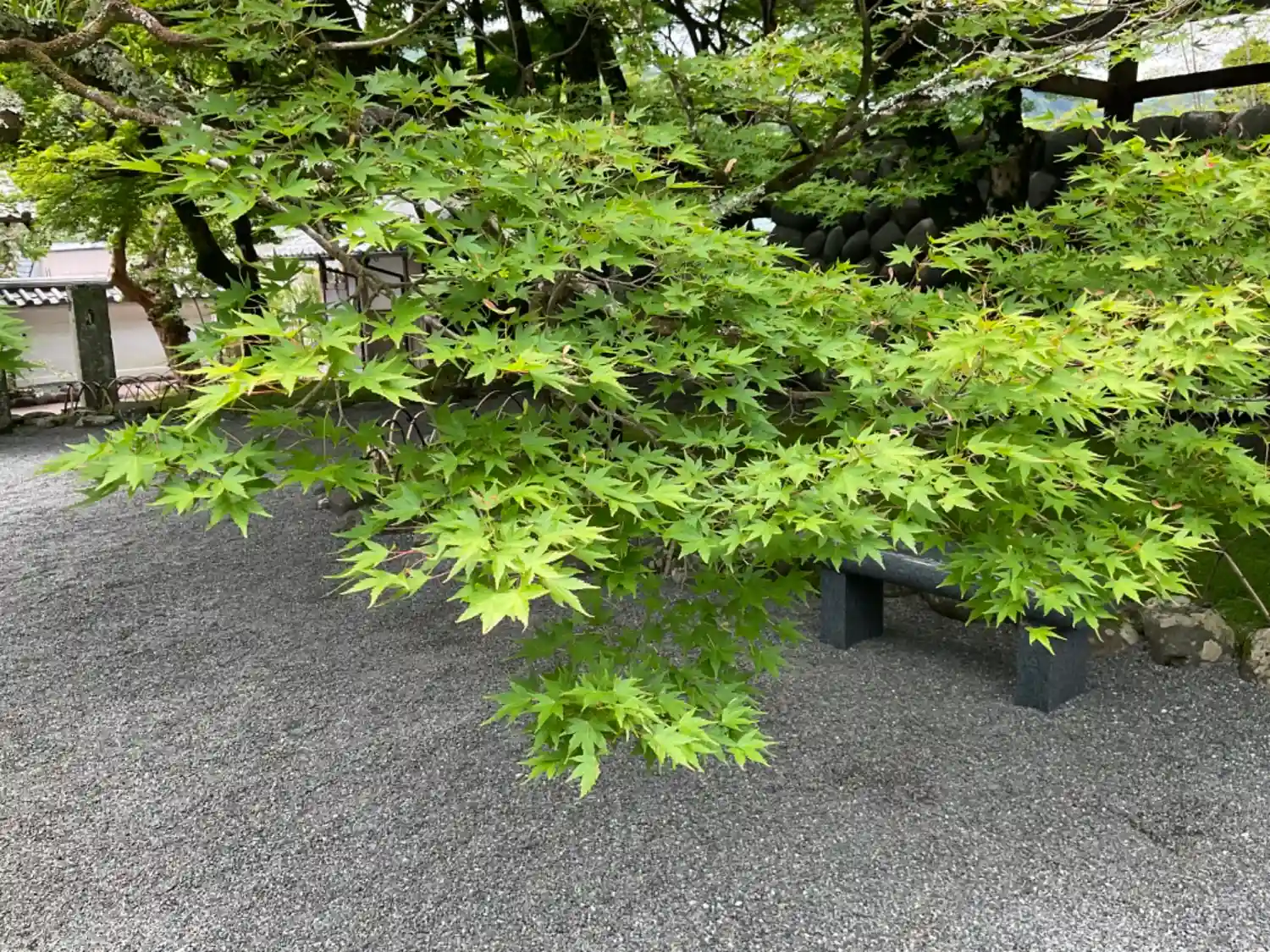 入り口の門と楓に降り注ぐ太陽。めちゃくちゃ暑かった。。。