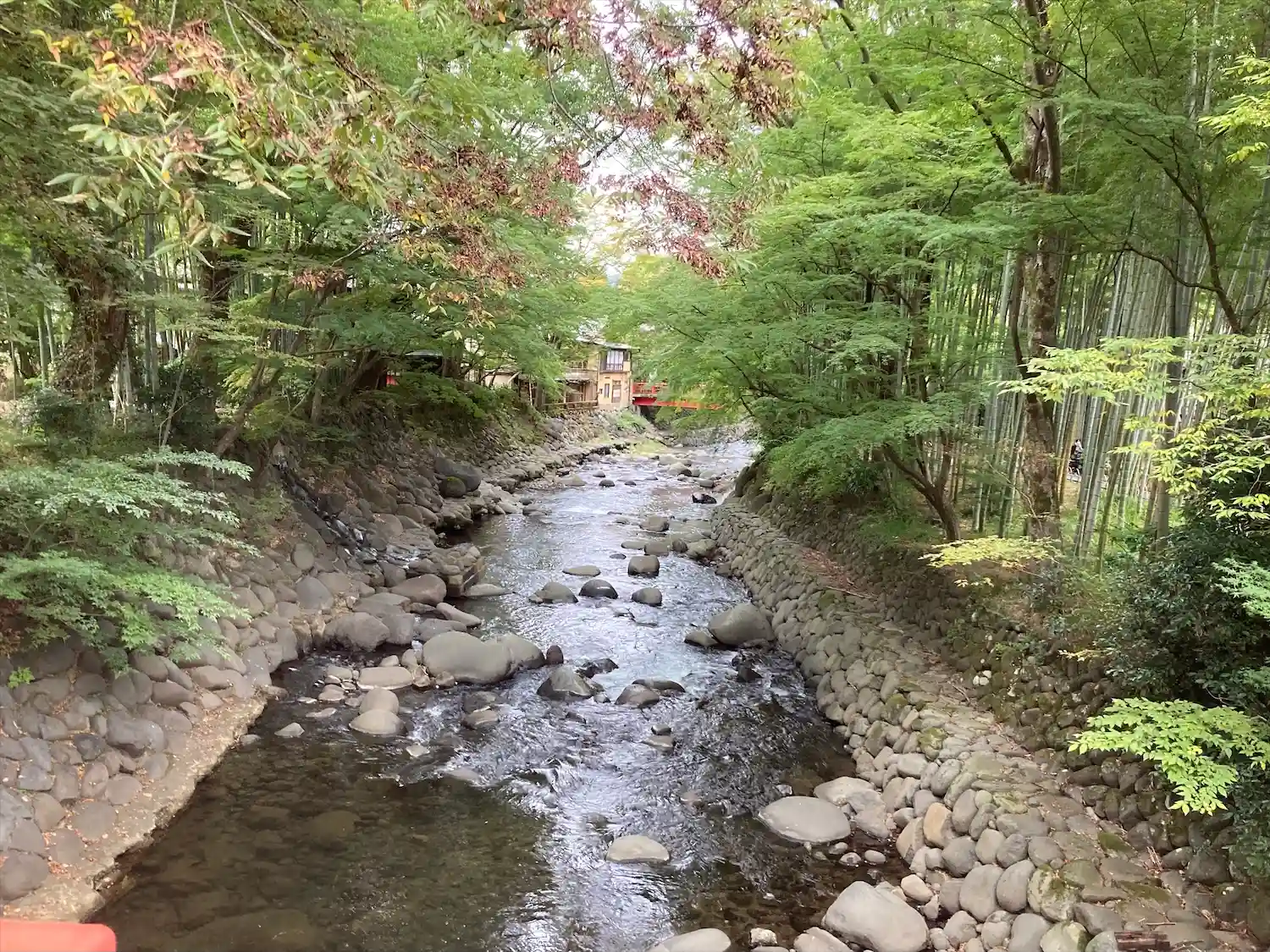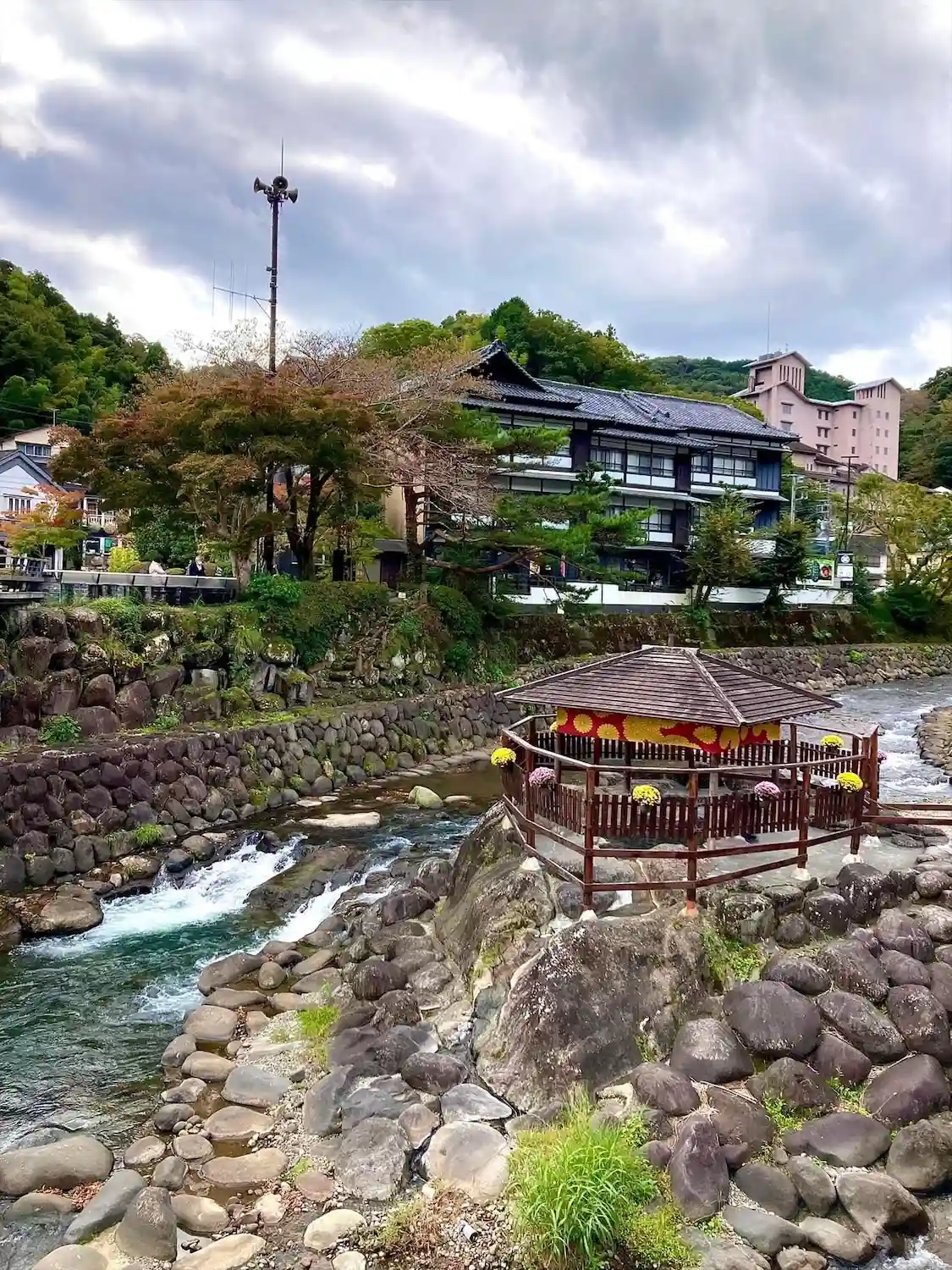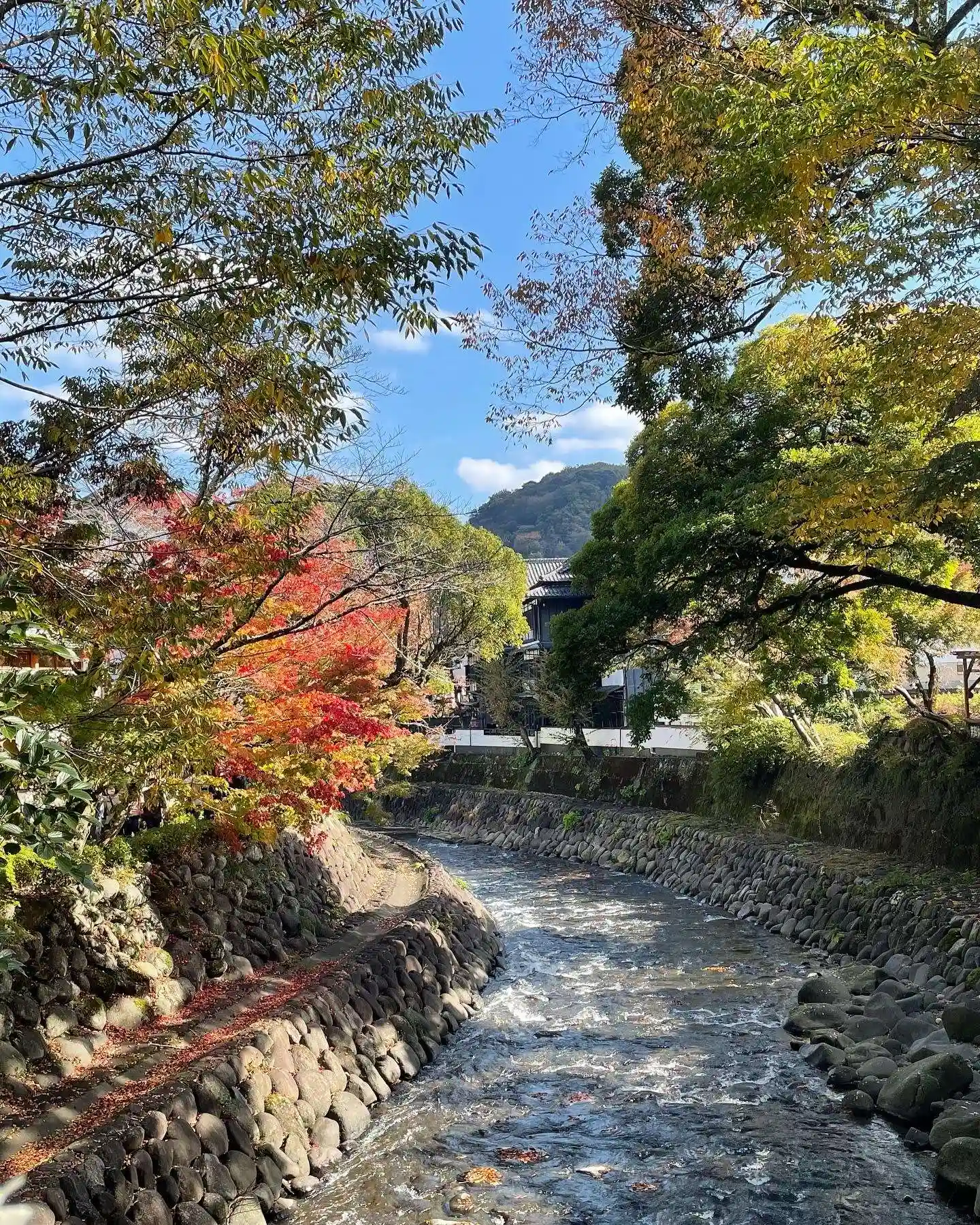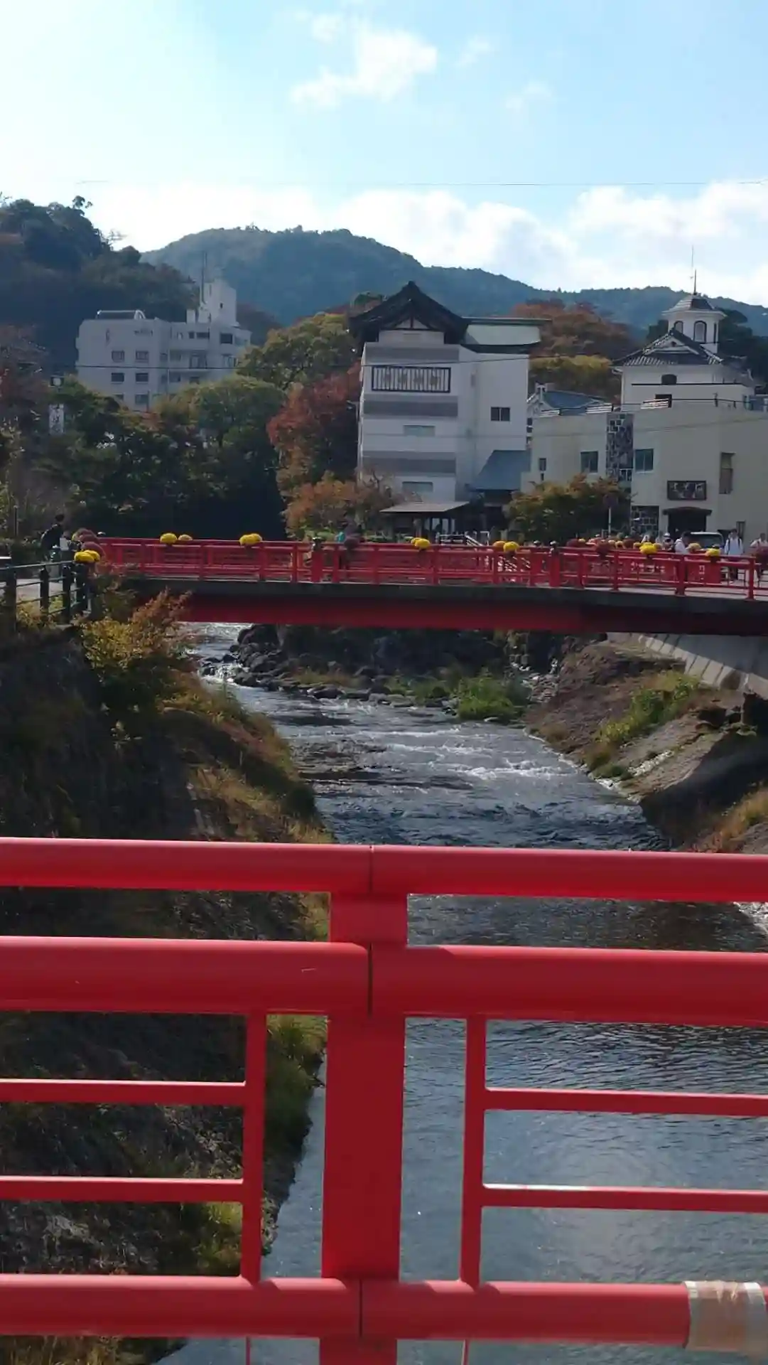 虎渓橋(あこがれ橋)の先に見えます✨温泉街を流れる桂川は戯曲「修善寺物語」で源頼家と桂が愛を育んだ場所、桂川にかかる5つの橋をめぐって修善寺にお参りすると思いが叶うと言われているそうです💕