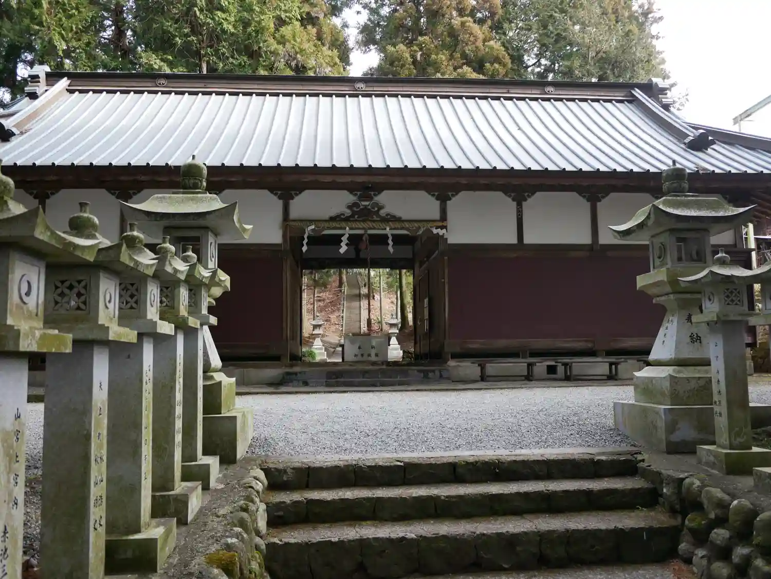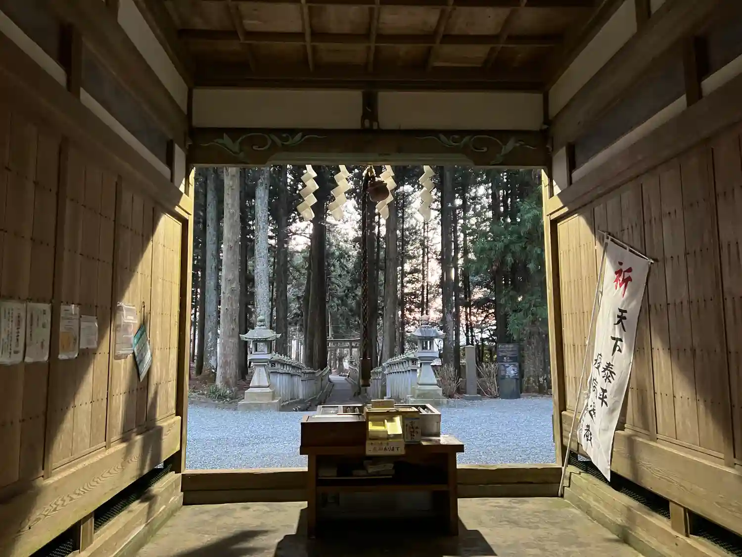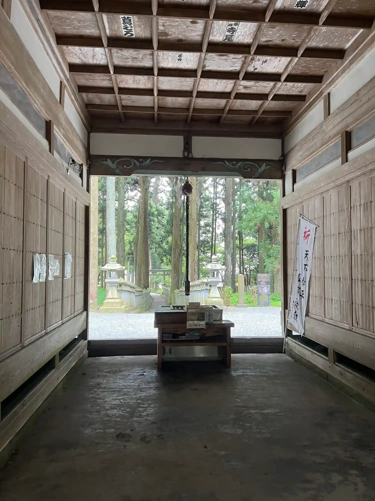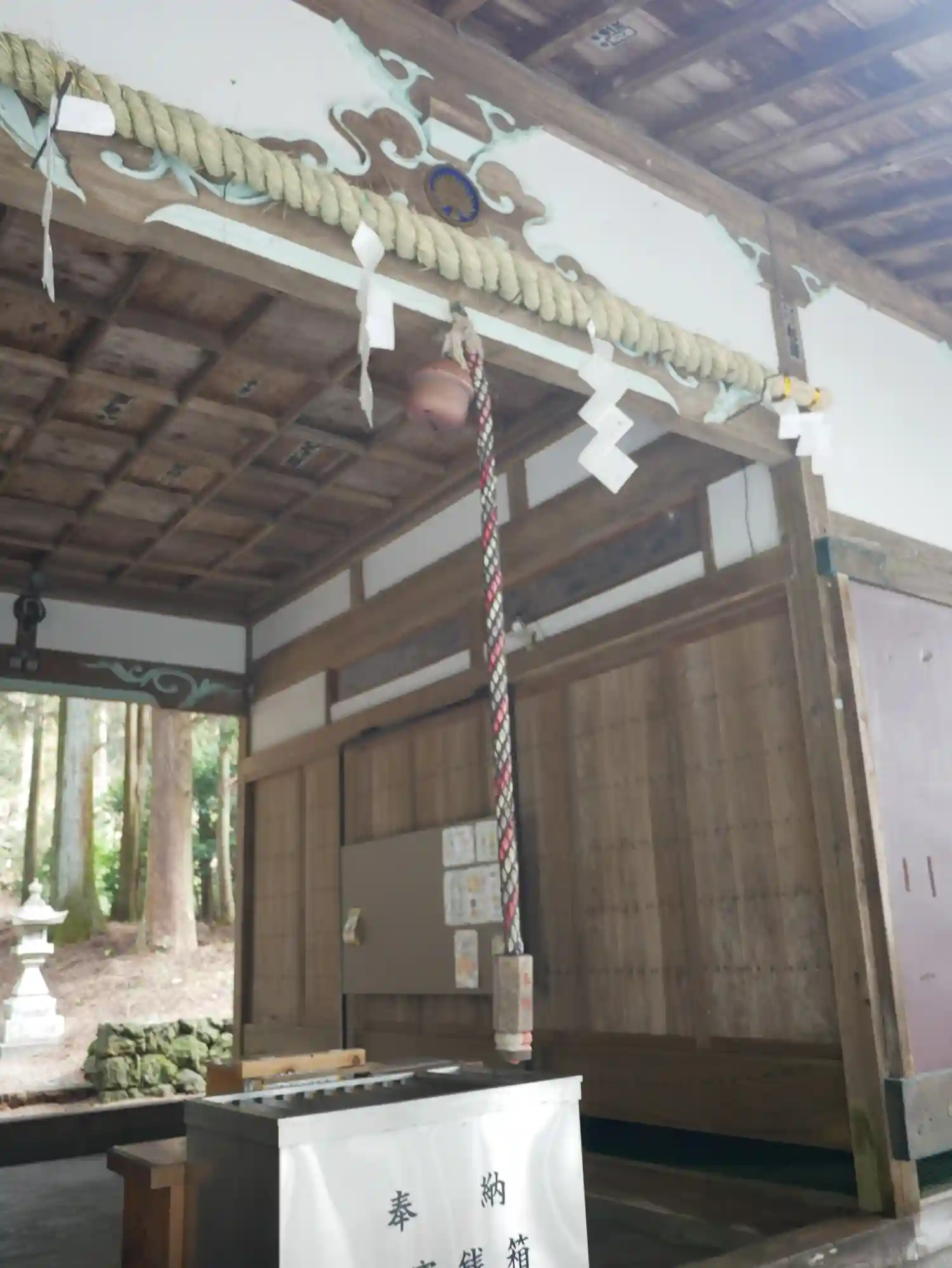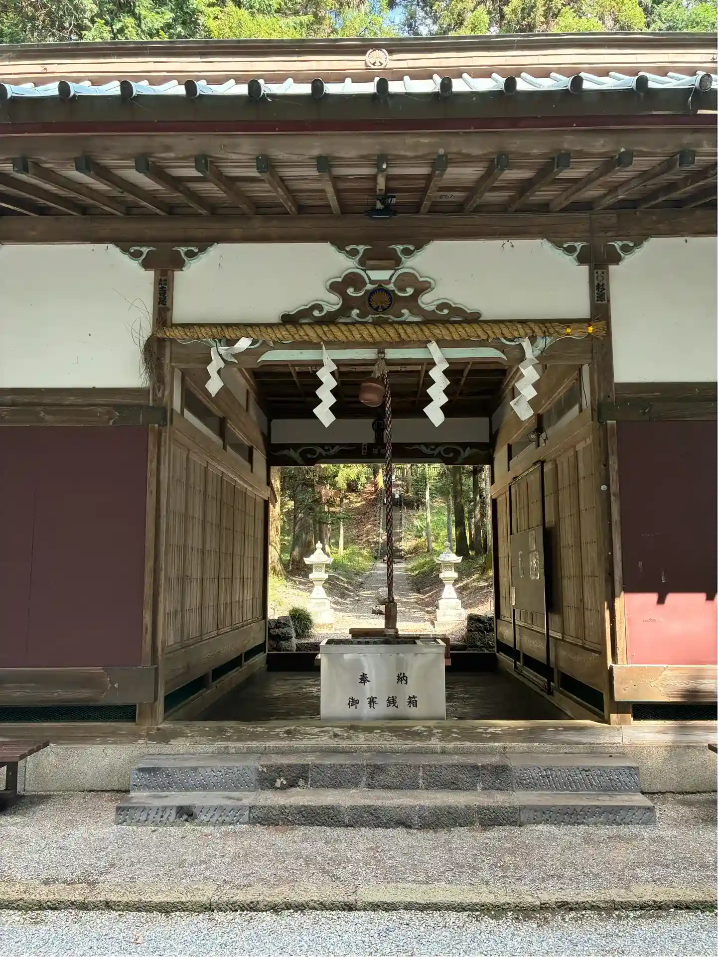 鳥居を潜り、灯篭の間を通っていくと、お賽銭箱が置かれた拝殿(籠屋というそうです)があり、さらに奥に…