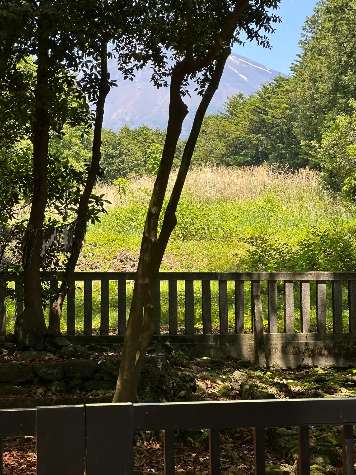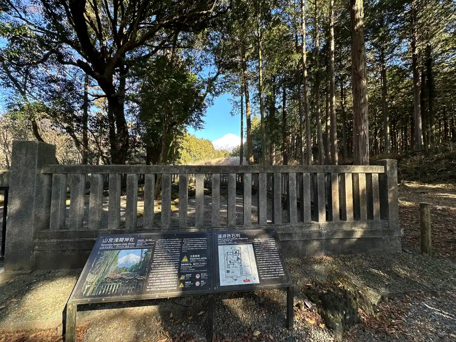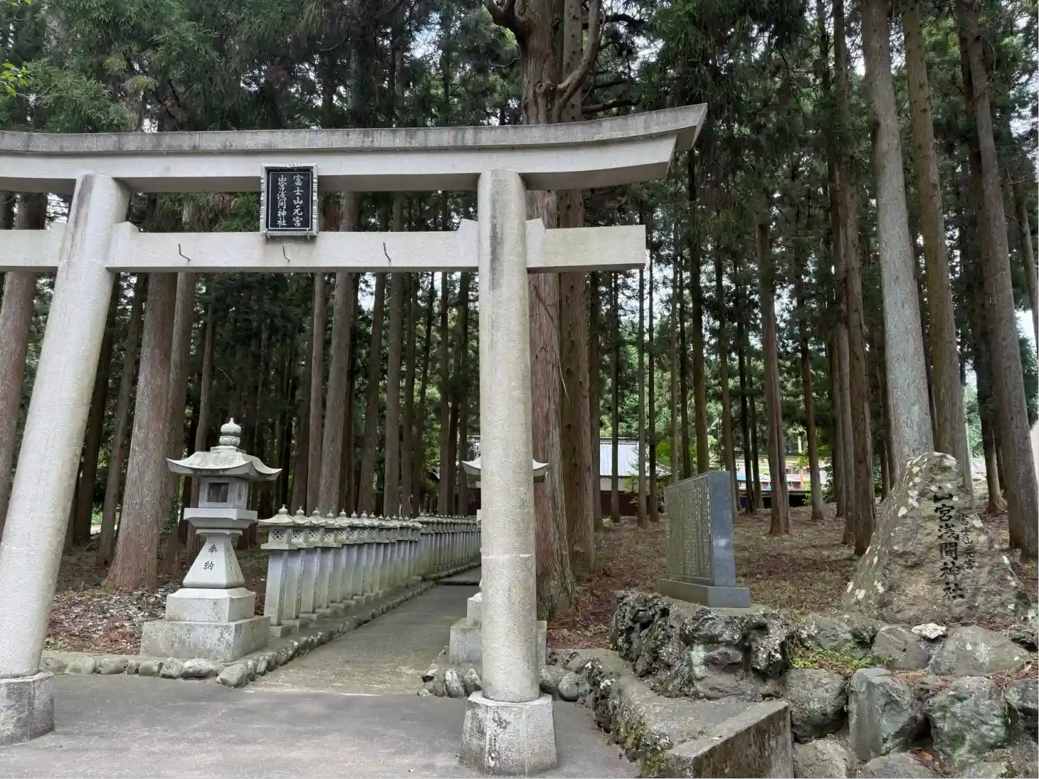 うっそうとした木々の間から見える霊峰富士そのものが拝殿となる山宮浅間神社です…