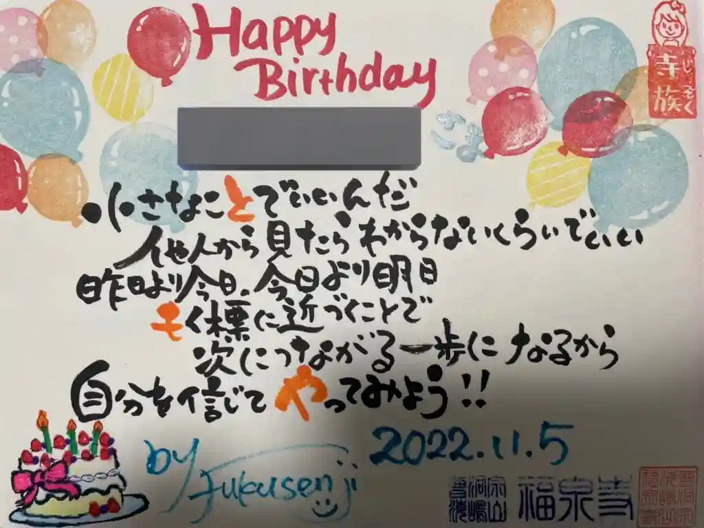 誕生日御朱印。名前と誕生日を入れてくださいます。