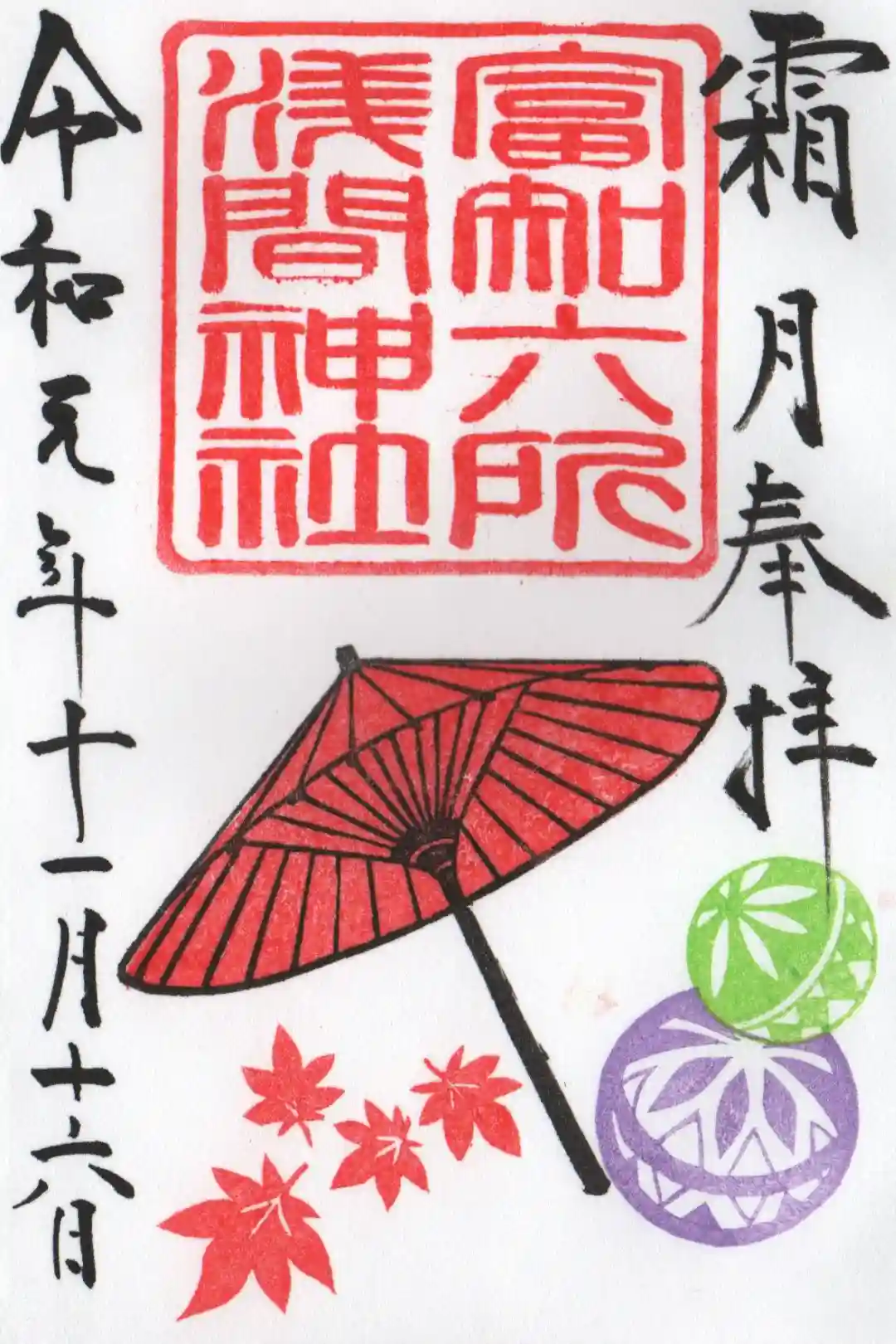 真ん中に富知六所浅間神社と書かれ、右上に社紋、真ん中に富知六所浅間神社の印、下部に富士山の絵がダイナミックな印が押されています。夏越の大祓、季節の植物やモチーフが入ったカラフルな月ごとの限定御朱印もあります。 | |||