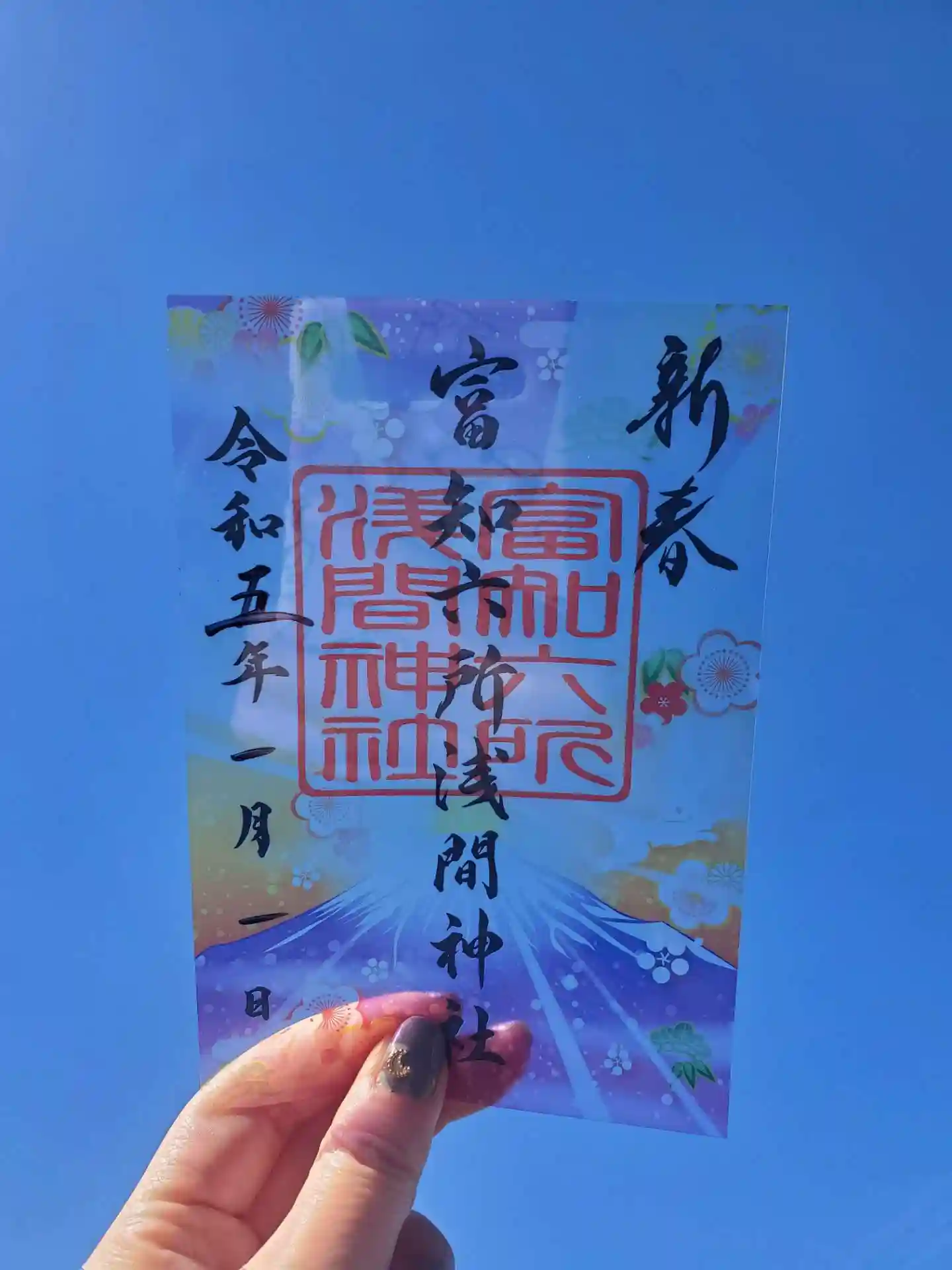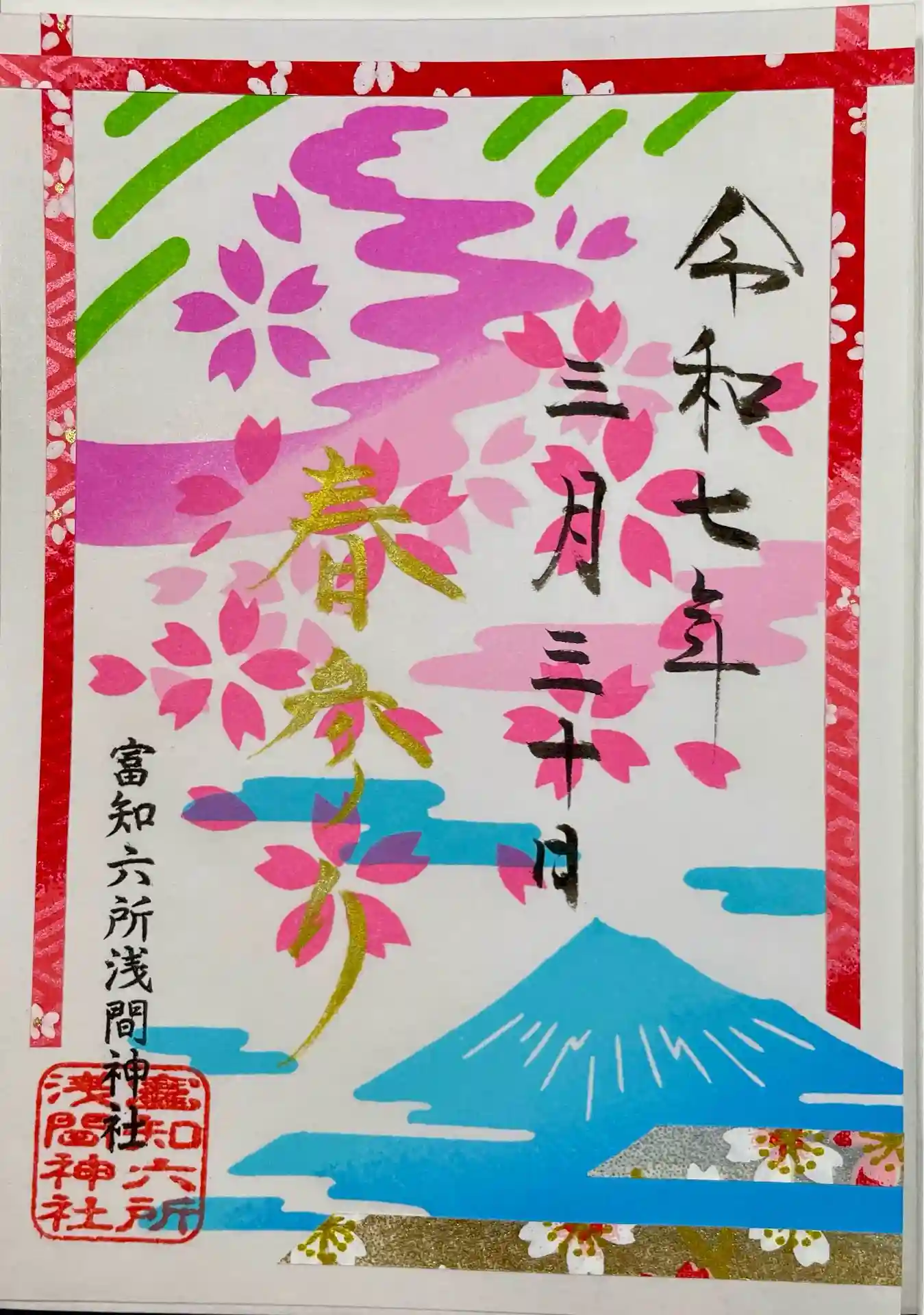 春参り切り絵御朱印と春参り御朱印、桜模様と水色の富士山の富知六所浅間神社の御朱印を頂きました。