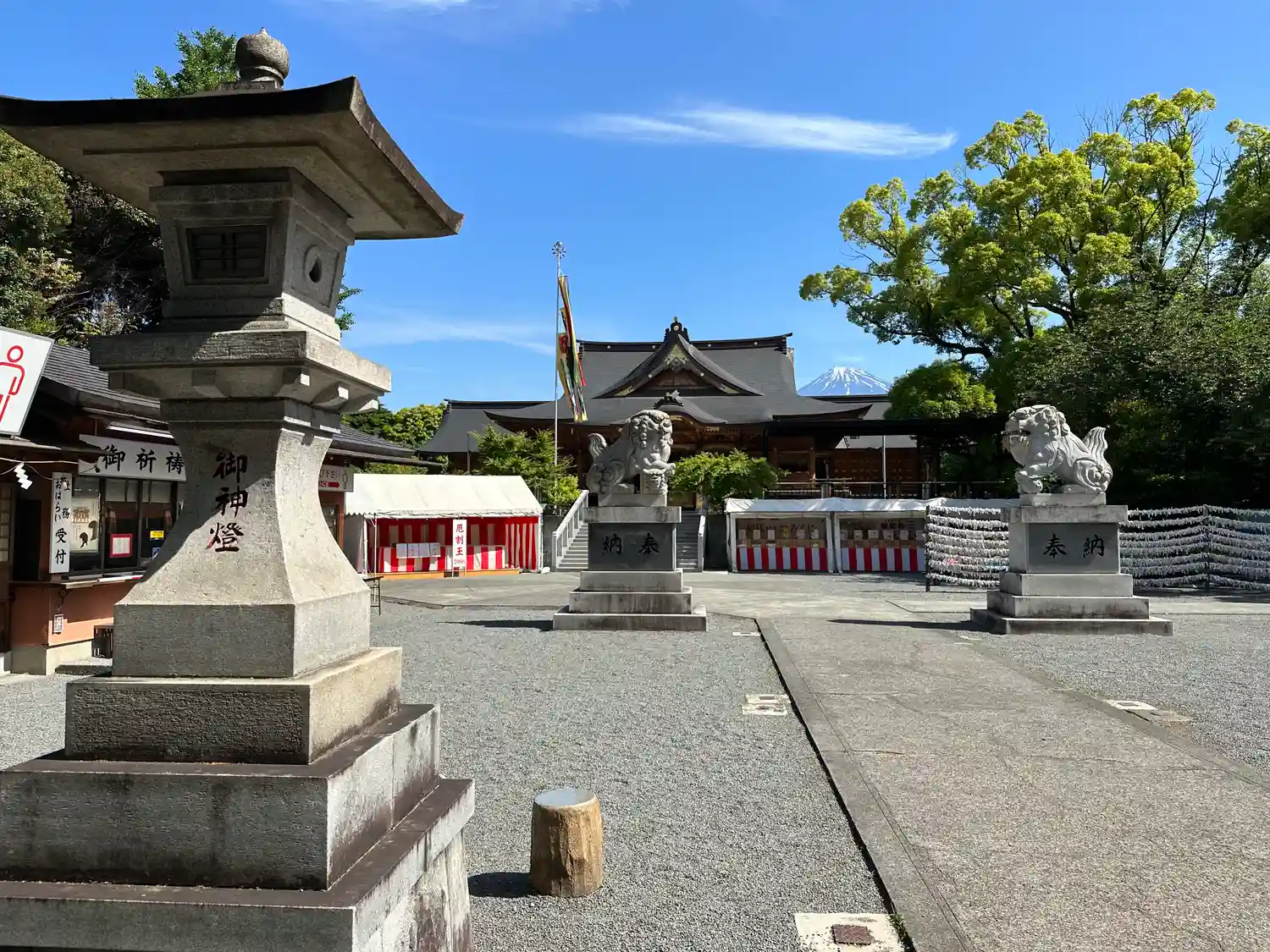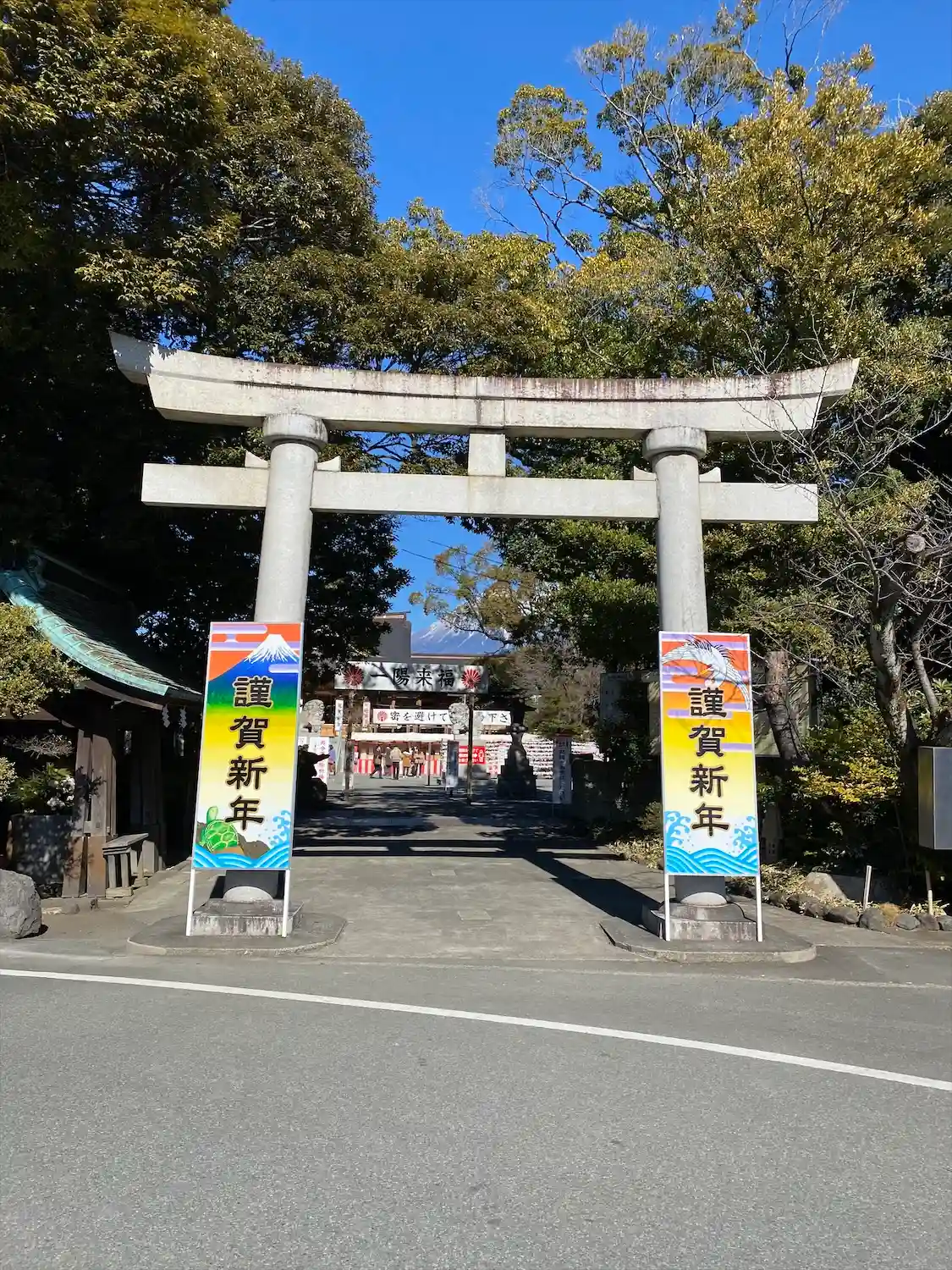 神社の奥に富士山が見える