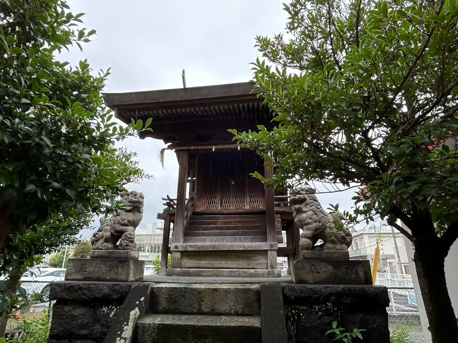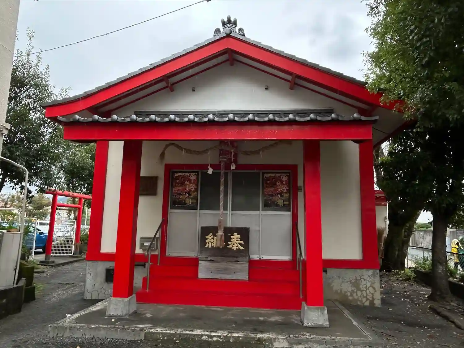 駅前の商店街の中にあります。朱色の社殿が綺麗でとても目立ちます。
