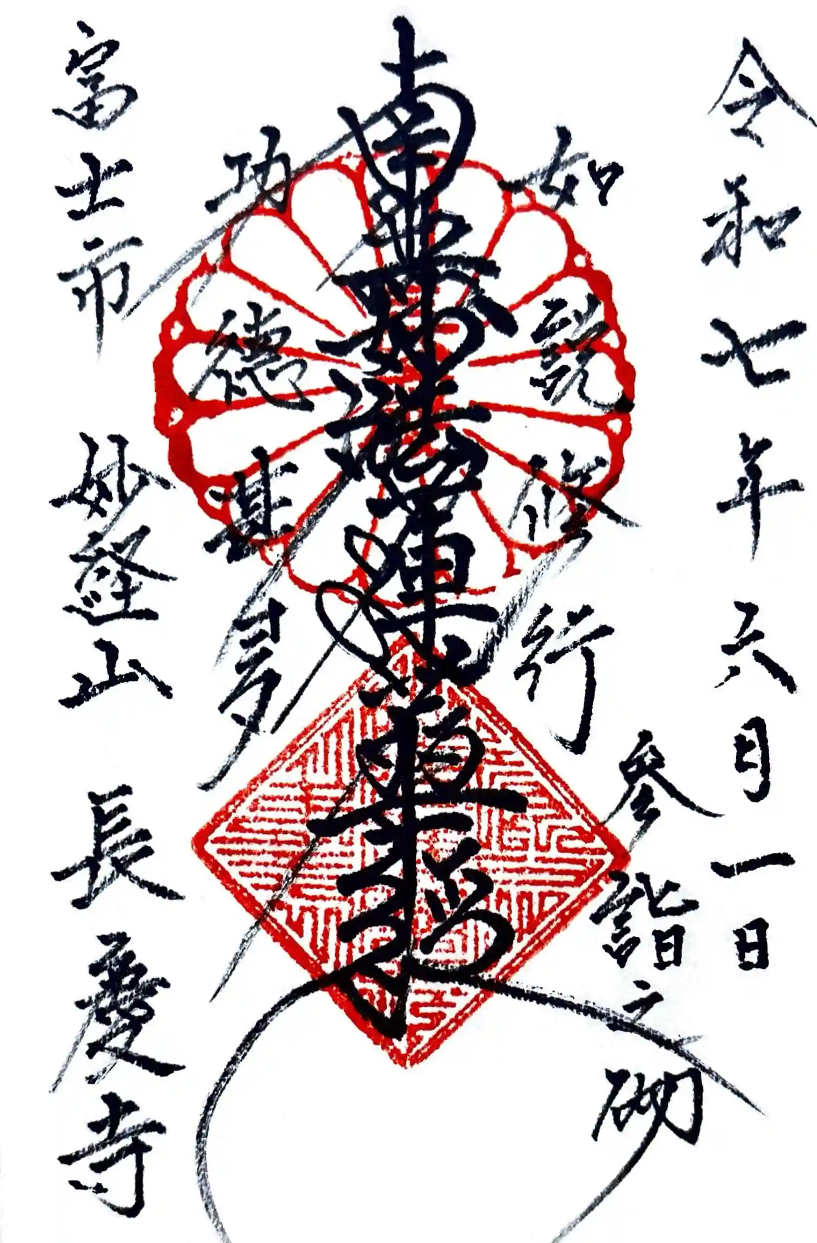 本殿は施錠されていたので本殿隣の庫裡に向かい、インターホンを押すと御住職の奥様が温かく出迎えてくれました。書置きの限定御首題をいただきましたが、直書きの御首題もお願いすると快く「大丈夫ですよ」と。奥からお見えになった御住職様も穏やかな表情で素敵な御夫婦です。御首題を待っている間、本殿にお参りさせていただき、その後も奥様とお話して過ごしました。限定御首題のデザインは息子さん夫婦がされていることや同じ市内のお寺さんの御首題のこと…とてもほっこりする時間でした。