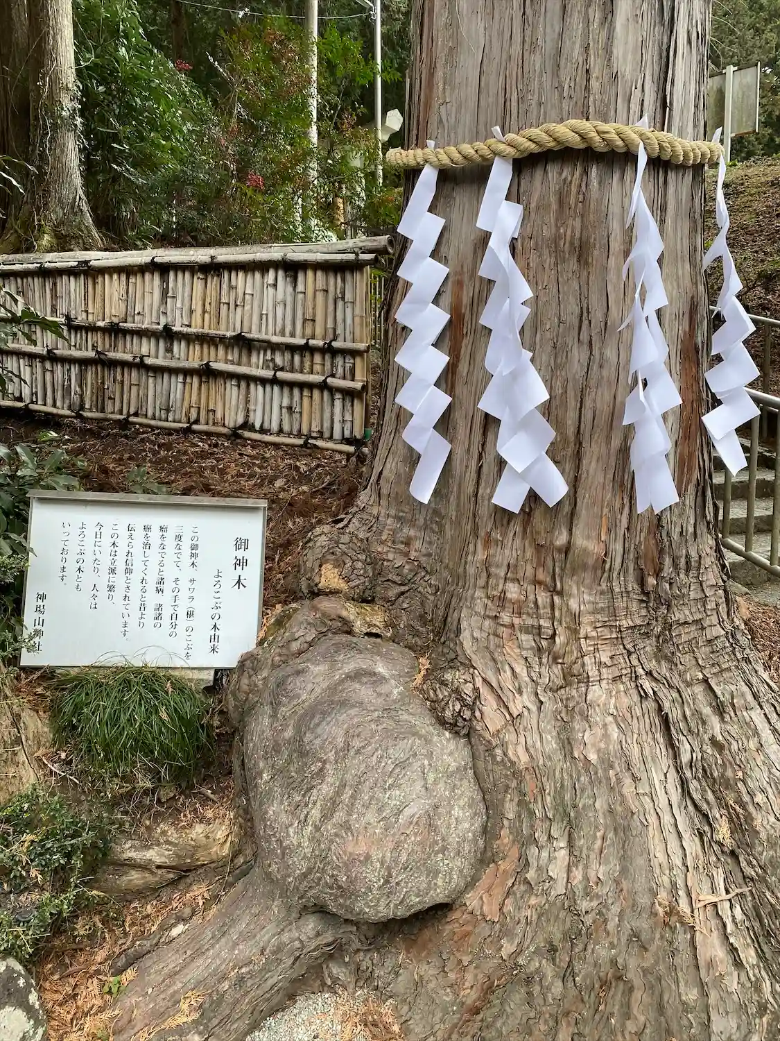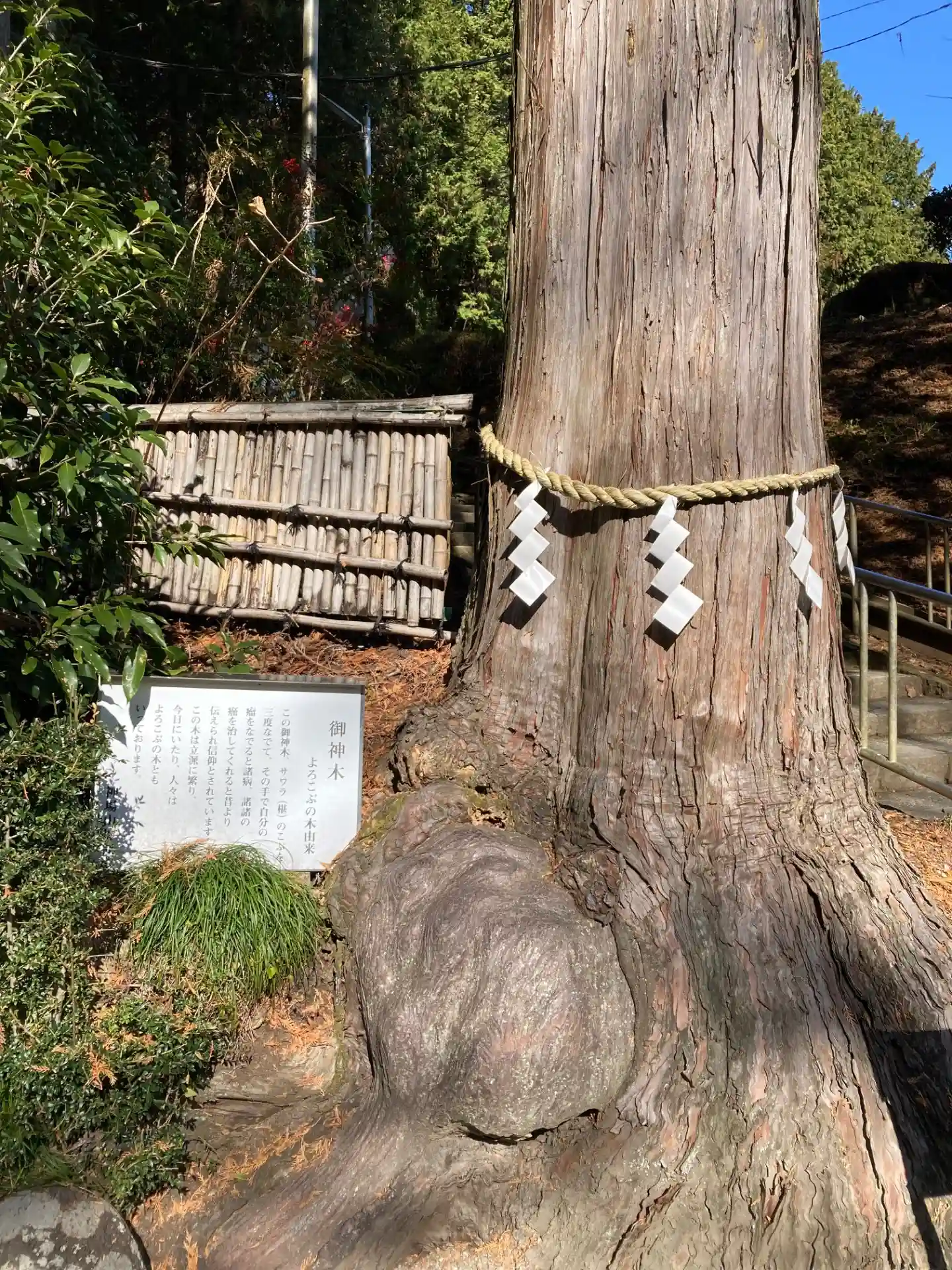 ご参拝させていただきました。御神木のコブに触って身体の悪いところをなでると治るそうですよ。厄を切る…
