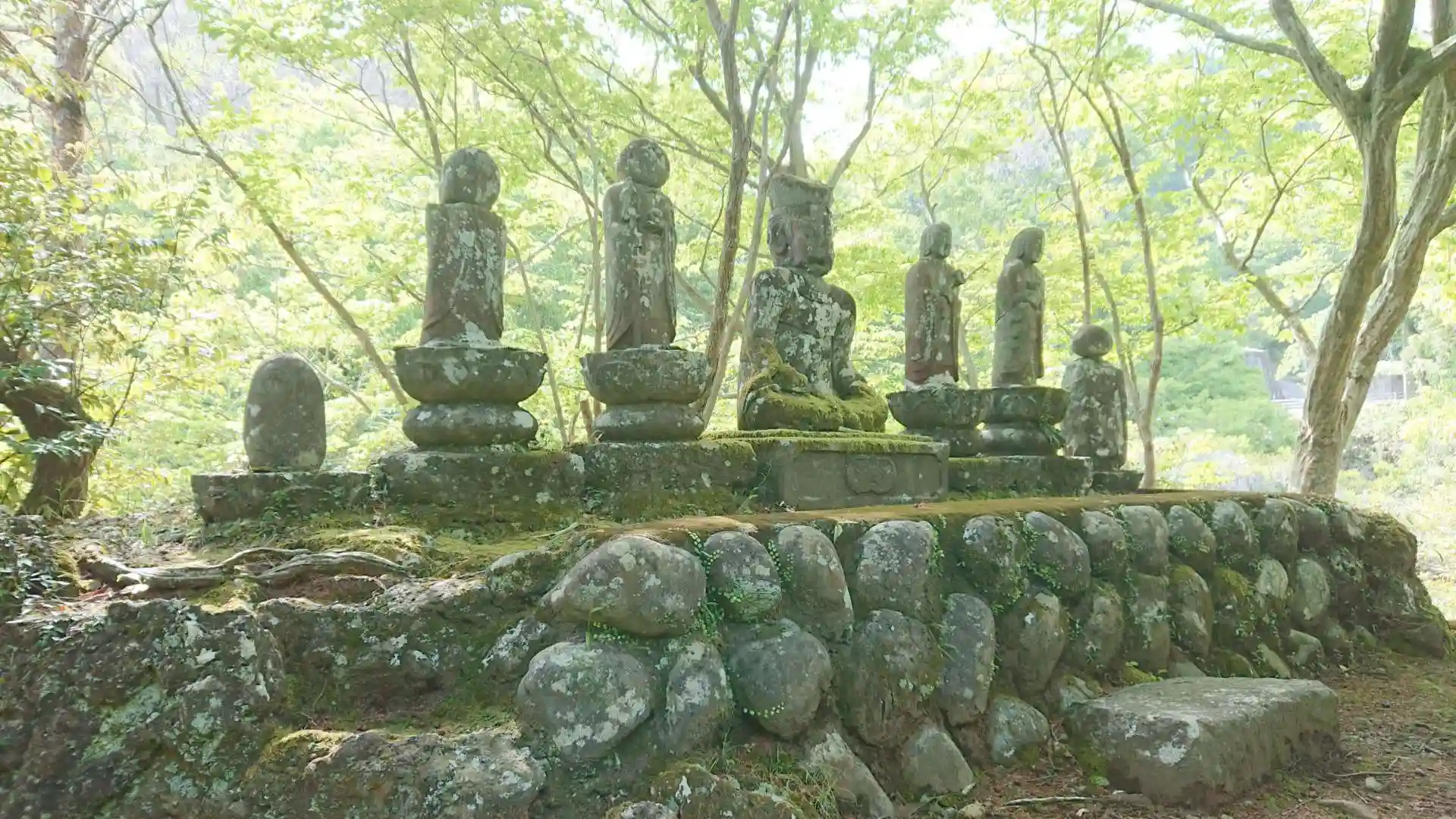 苔むした石仏や石塔が立ちならんでる。
