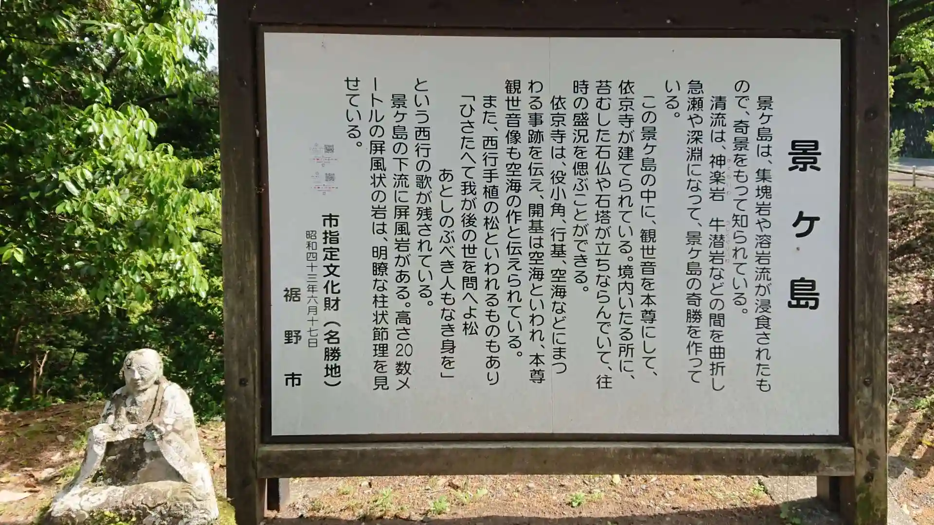 景ヶ島は、集塊岩や溶岩流が侵食されたもので、奇景をもって知られている。清流は、神楽岩(かぐらいわ)・牛潜岩(うしくぐりいわ)などの間を曲折し急瀬や深淵になって、景ヶ島の奇勝を作っている。