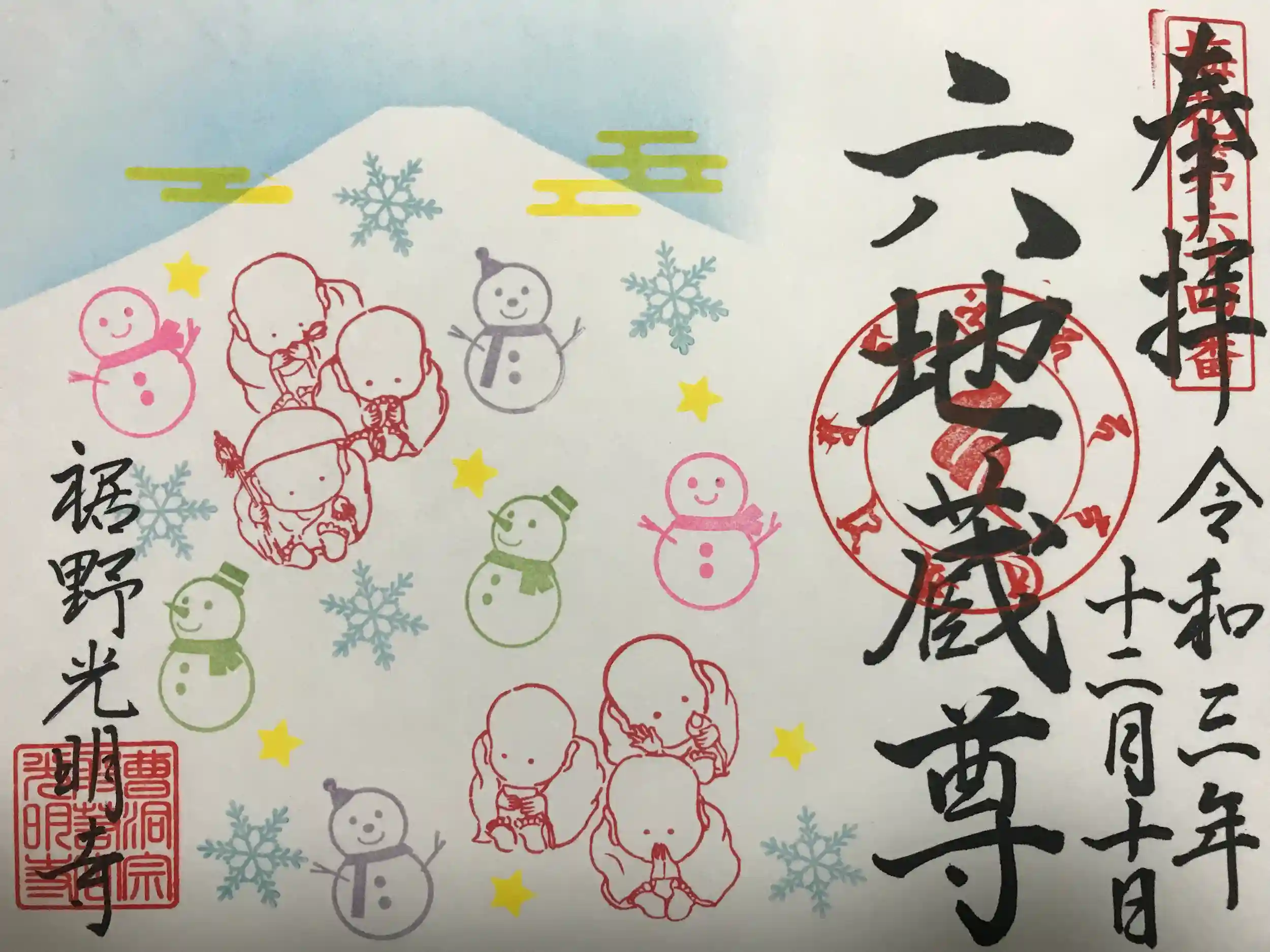 『六地蔵尊と雪だるま・雪の結晶』