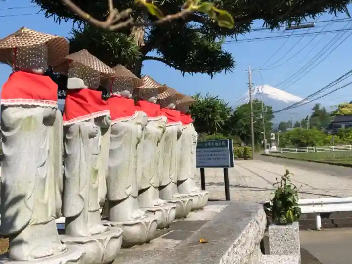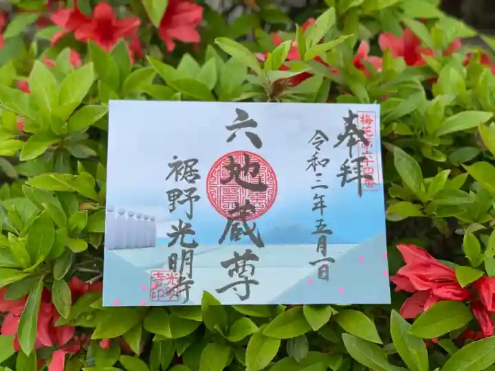 光明寺から見える6体のお地蔵様(六地蔵)越しの富士山と5月に咲くツツジ、田植えを終えて青々と輝く水田の風景をデザインした御朱印です。