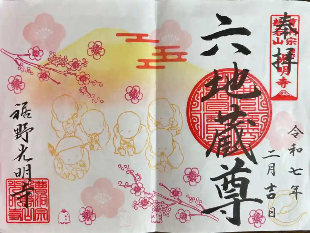 光明寺から見える6体のお地蔵様(六地蔵)越しの富士山と5月に咲くツツジ、田植えを終えて青々と輝く水田の風景をデザインした御朱印です。