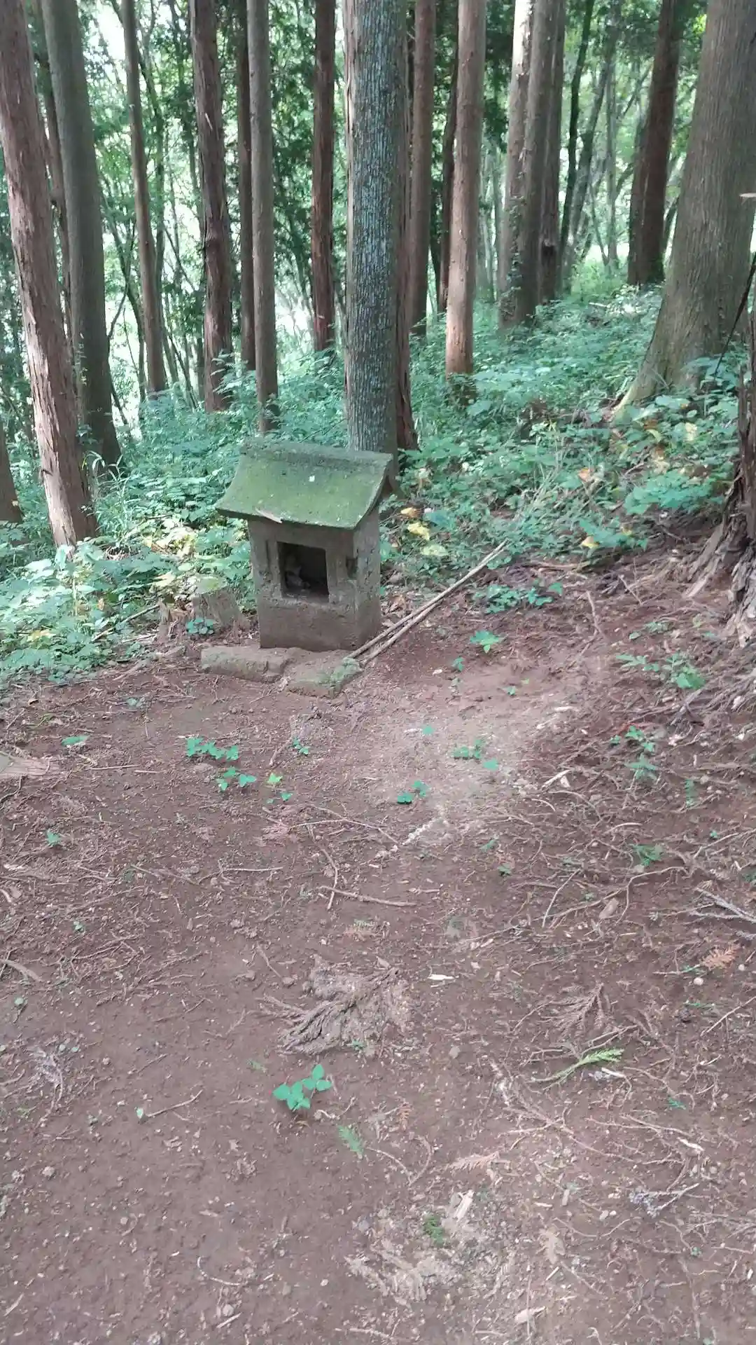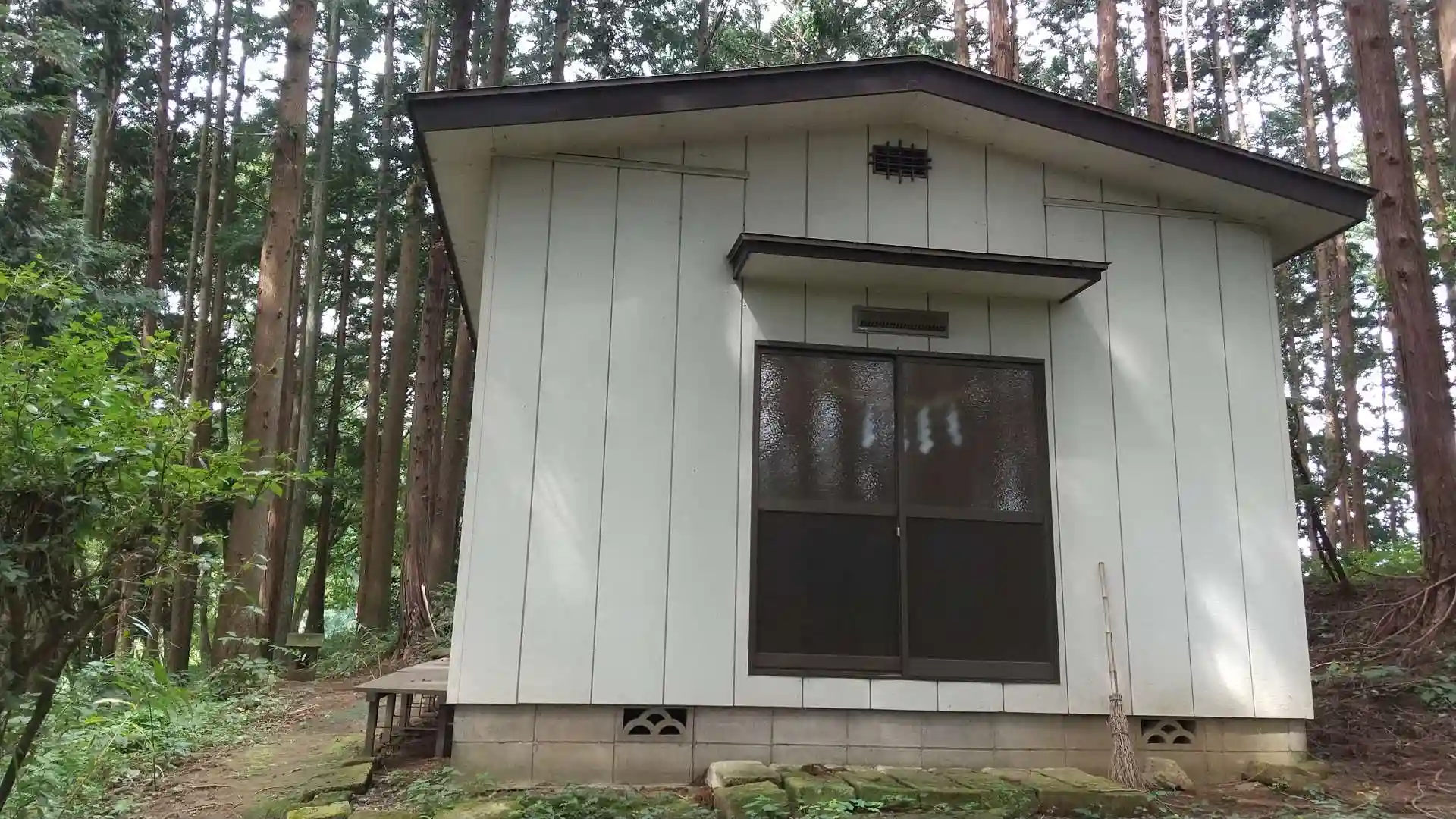 山の斜面に100段の階段があり、その先にプレハブの社殿。