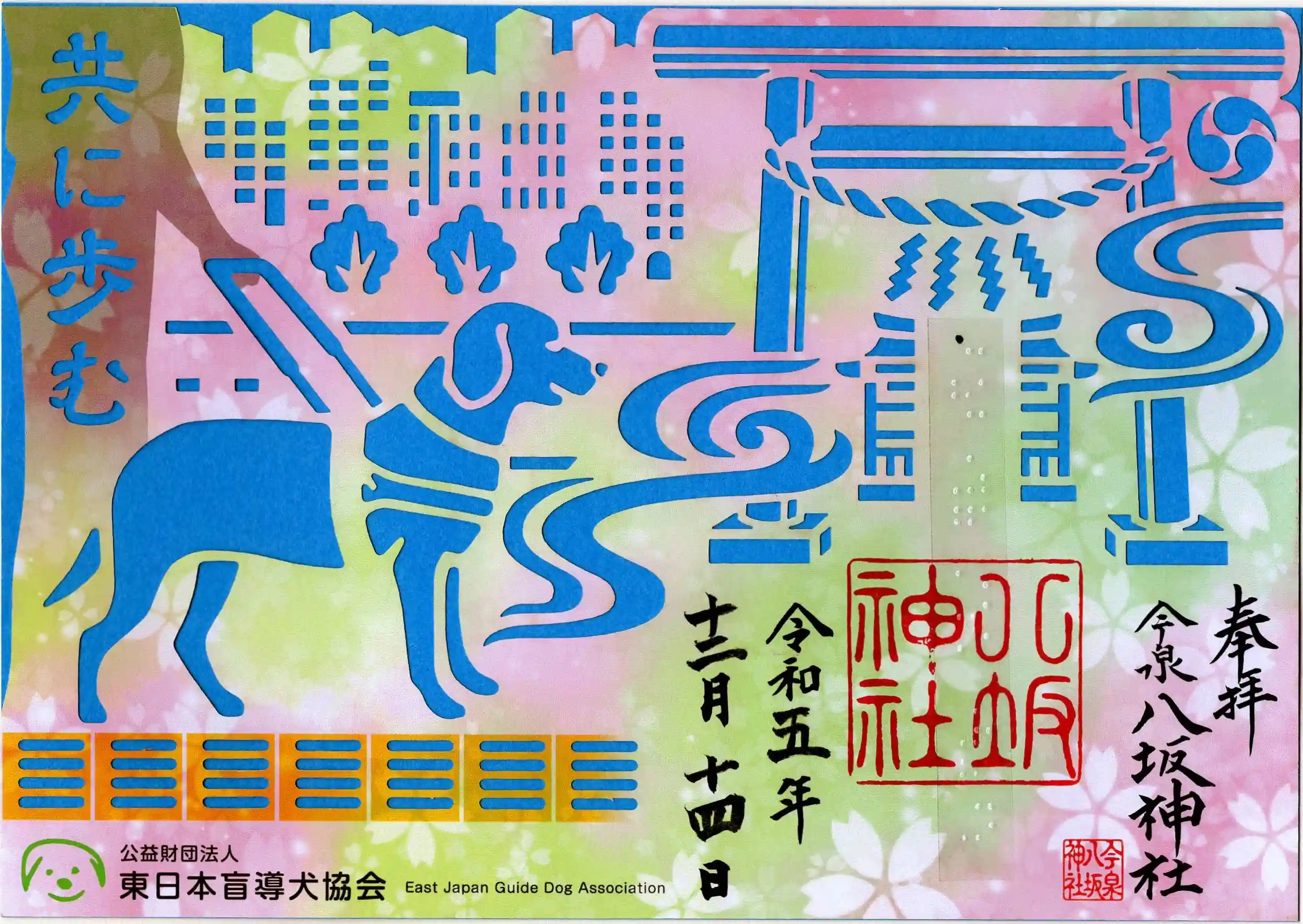 コンパクトな境内ですが立派な神楽殿もある神社です。盲導犬支援に賛同して切り絵の御朱印をいただきました。