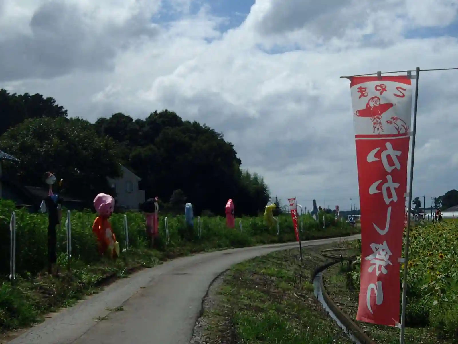 ひまわり畑は迷路になっていて、小さい子供さんとお父さんが挑戦しているのを周囲にたくさん立っている個性的なかかしが見てる、という感じでした。