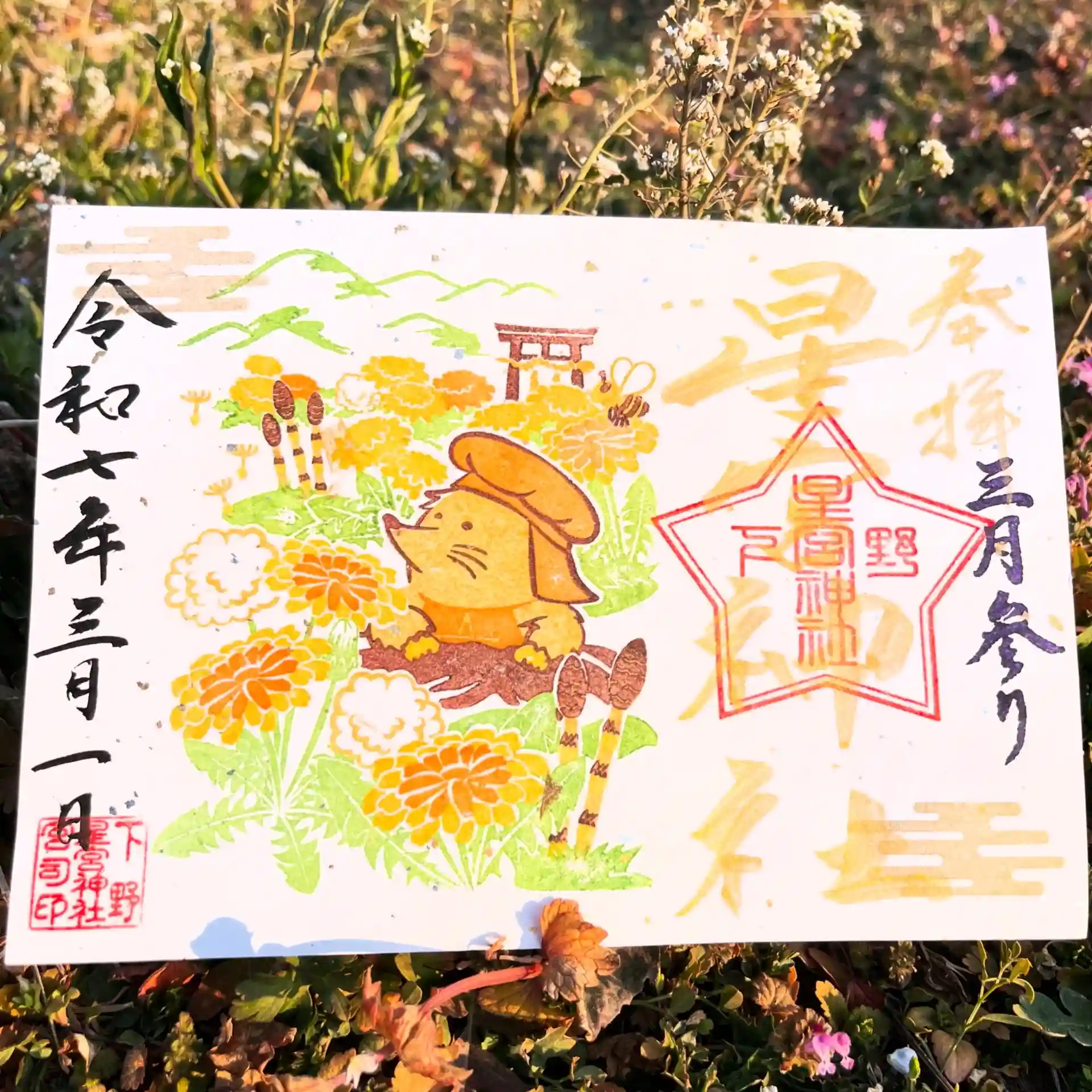 明日より3月月参り御朱印をお書き入れいたします。3月はこがねくんと春の陽気をモチーフにいたしました。
