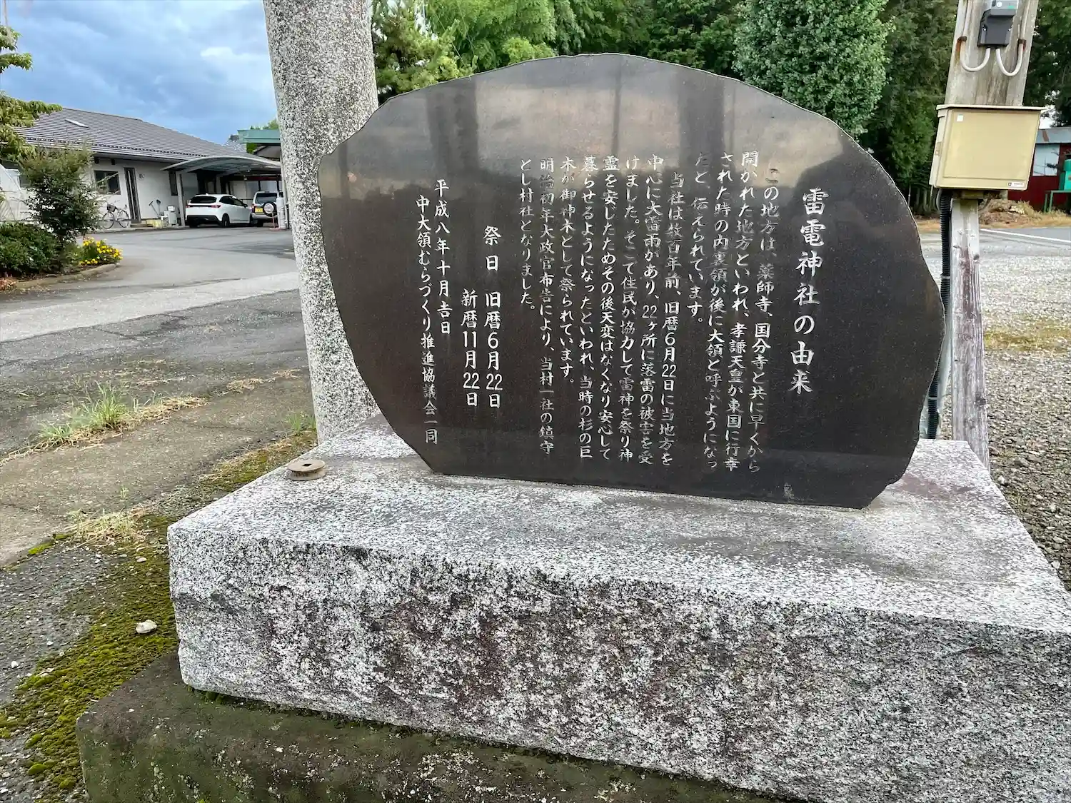 栃木県下野市中大領に鎮座し、嵐除けの御神徳をもつ大雷神を祀る。