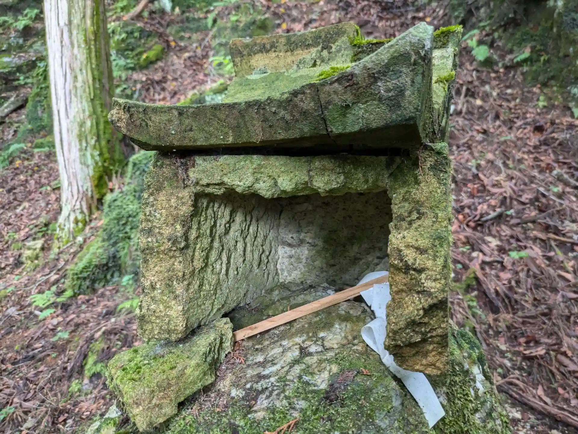 「行者返しの岩」の上の祠。急斜面なのでポール無しでは降りられません。